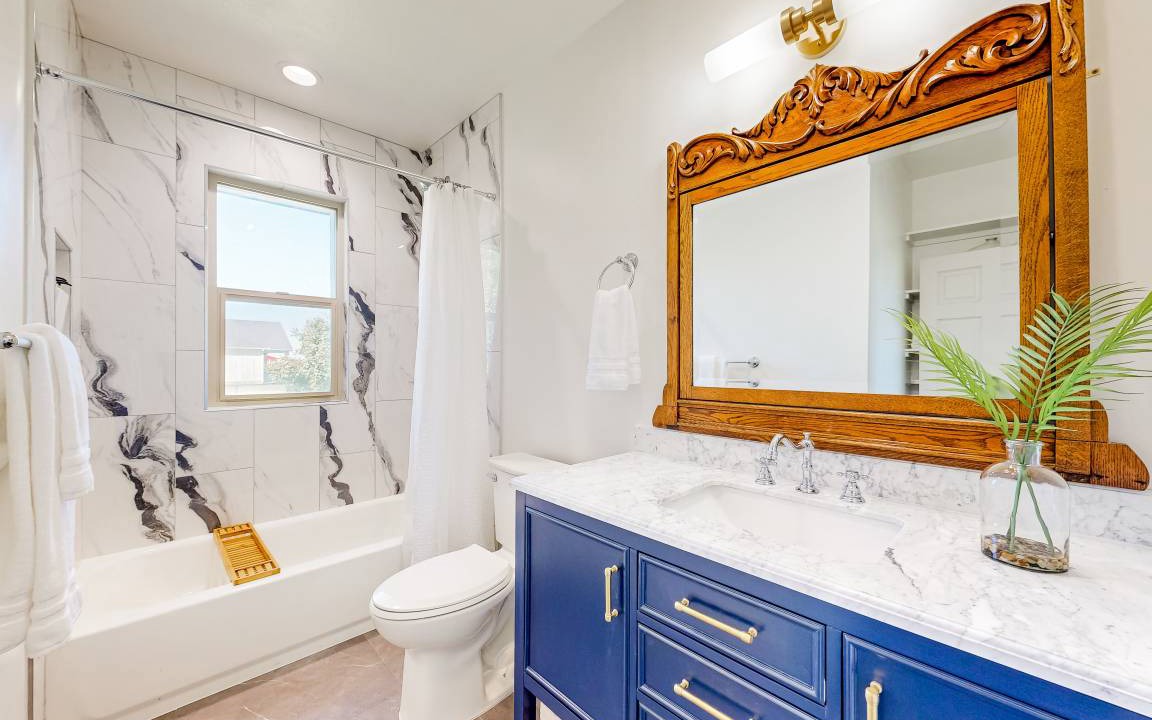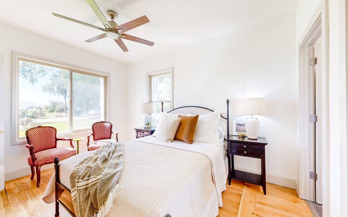 The bedrooms have soft linens, ceiling fans, and ample storage space - allowing you to pack light. The bathrooms are marble-lined with large vanities and shower/tub combos. Additional cozy perks include a wood-burning fireplace, partial air-conditioning, a washer/dryer, and a Pack-N-Play.