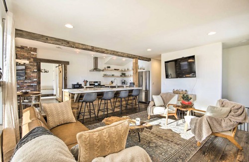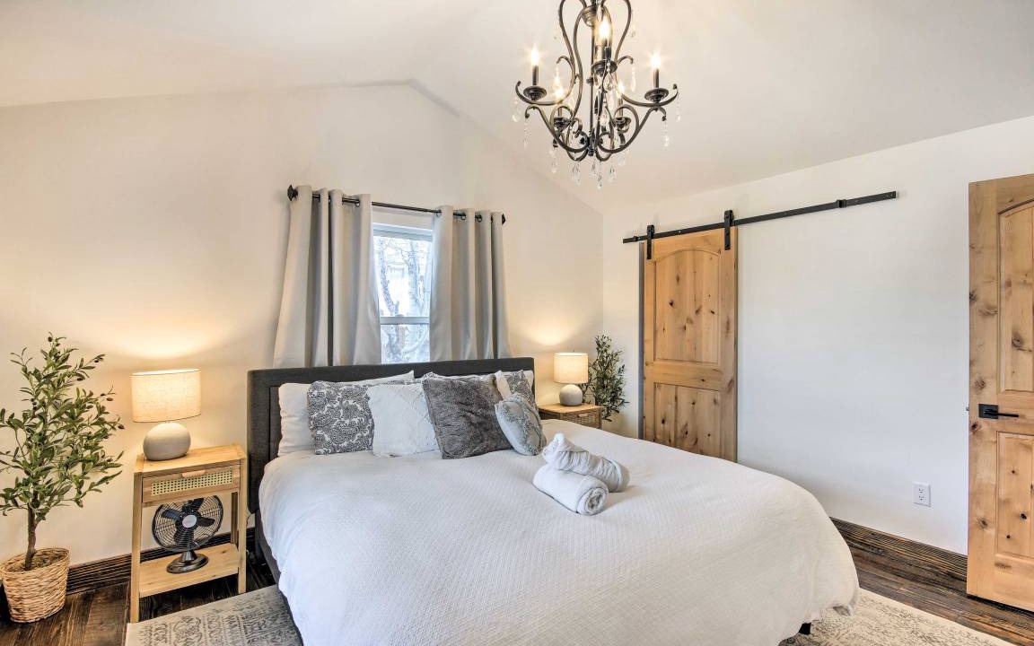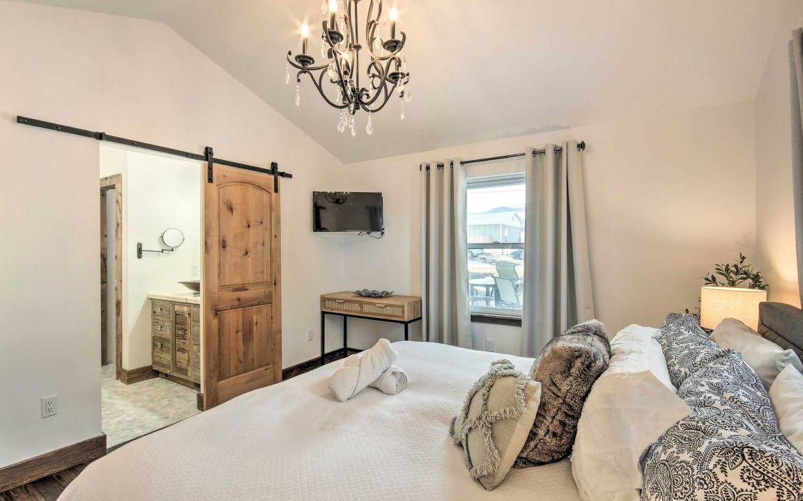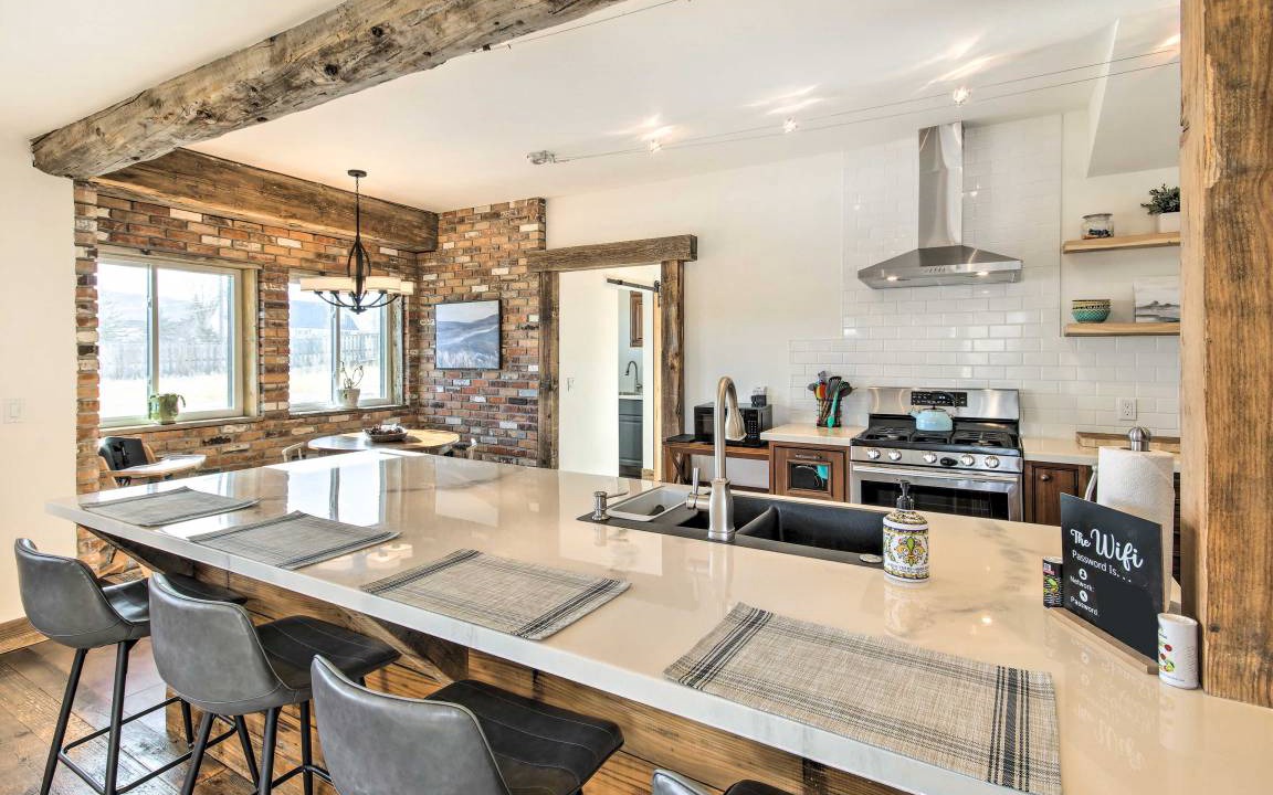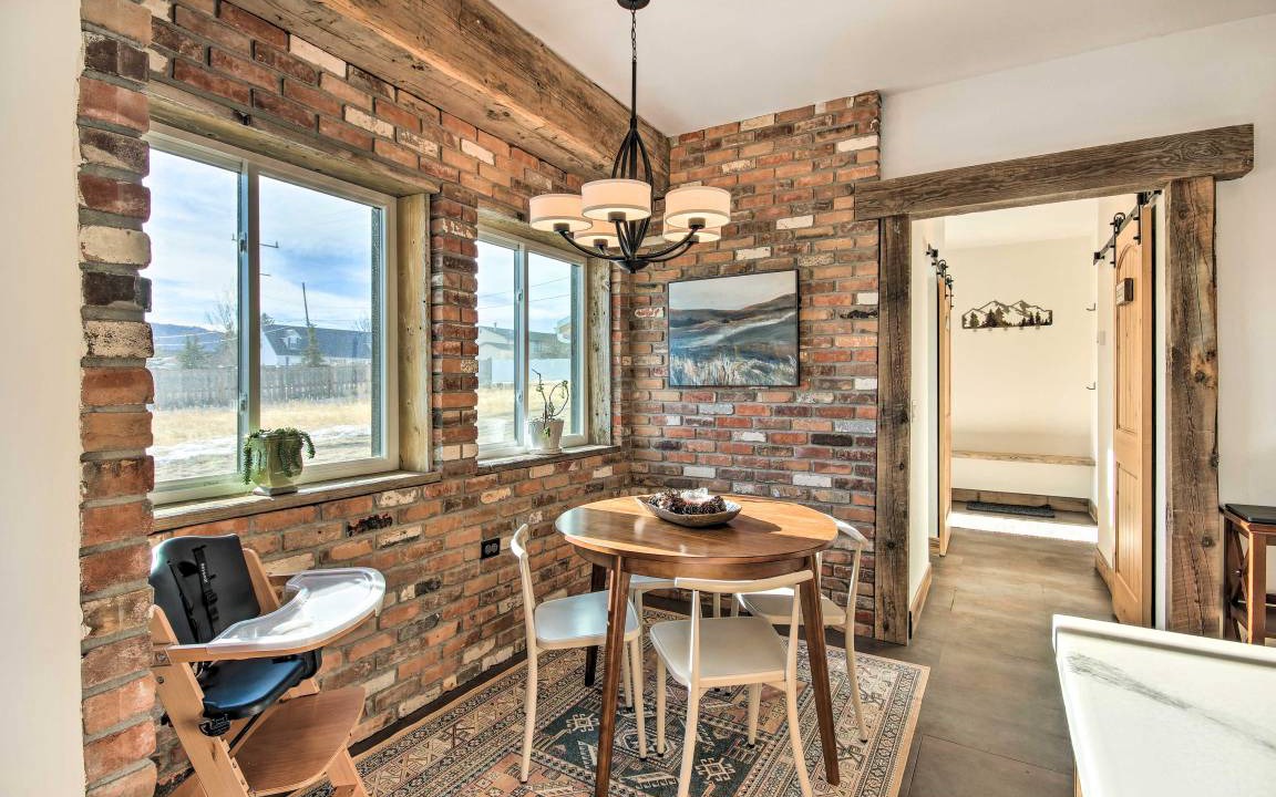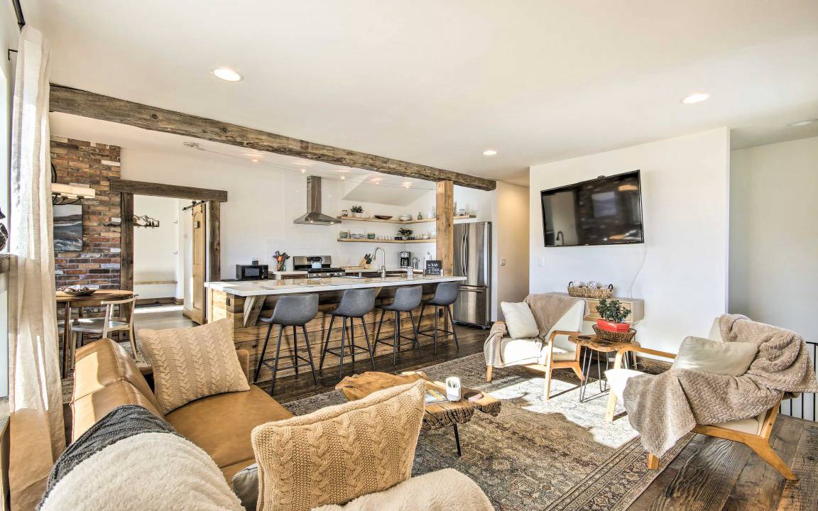 HOME FEATURES: 2 Smart TVs, dining table w/ chandelier, bedroom suite w/ en-suite bath (Bedroom 1), exposed brick & wood beams, modern luxury decor