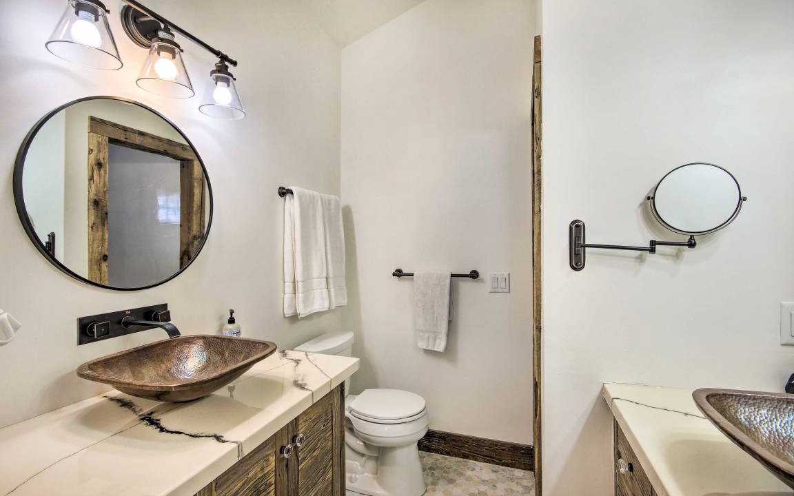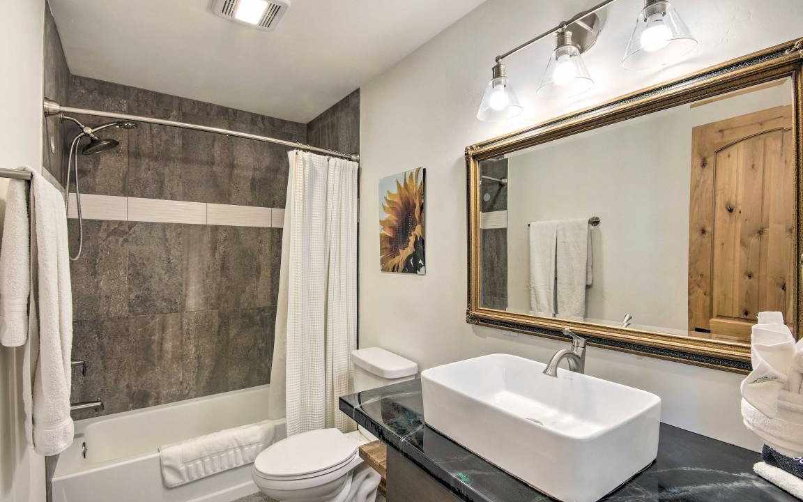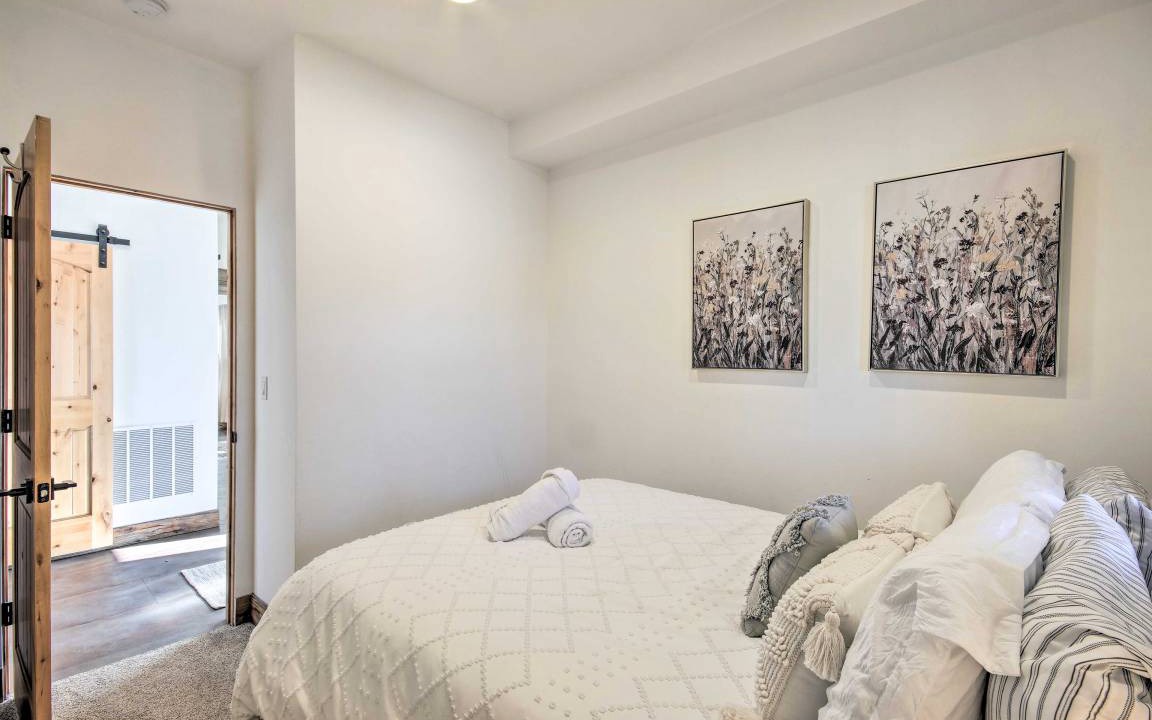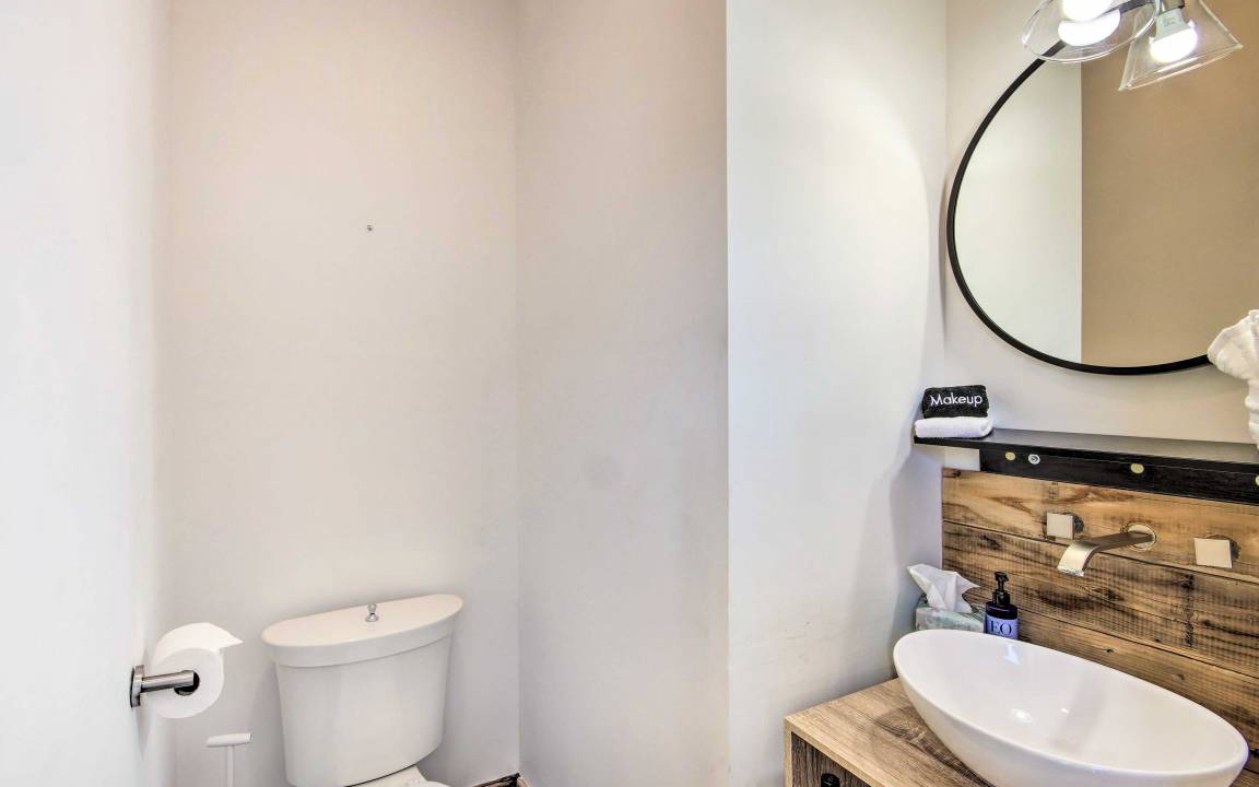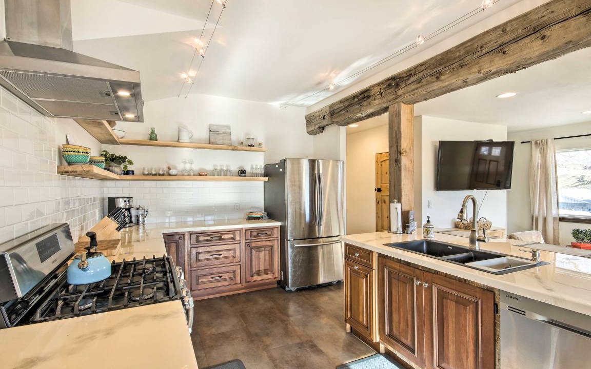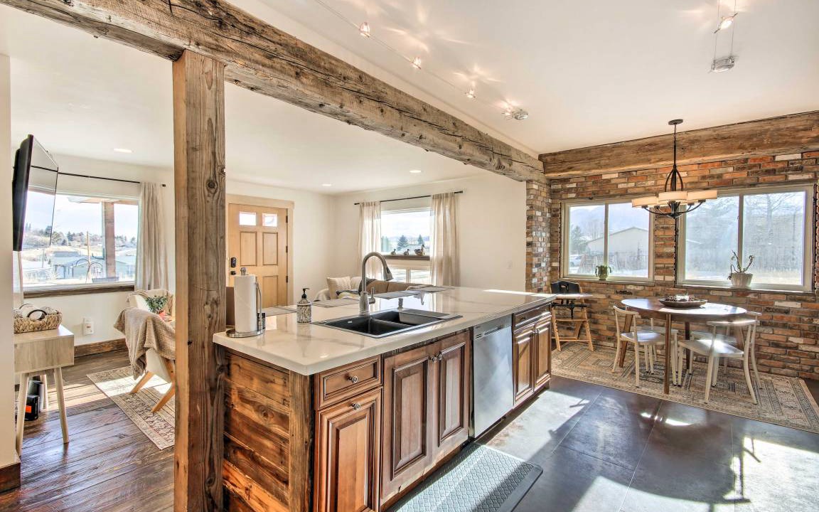HOME FEATURES: 2 Smart TVs, dining table w/ chandelier, bedroom suite w/ en-suite bath (Bedroom 1), exposed brick & wood beams, modern luxury decor