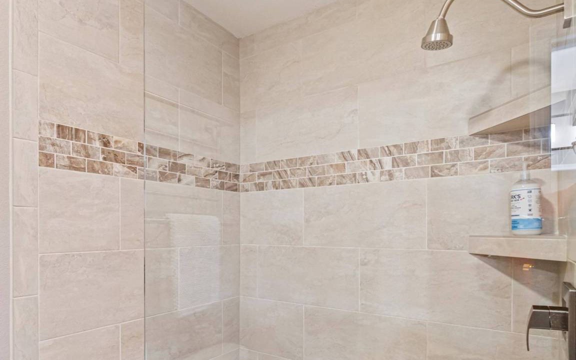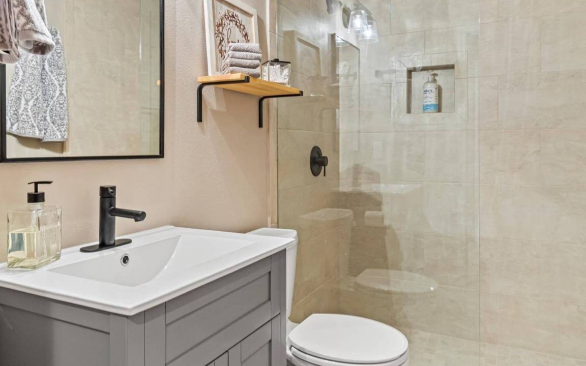 Full bathroom on main floor outside of Bdrm #2 with floor to ceiling tiled walk-in shower with glass surround, single vanity sink, and toilet.
