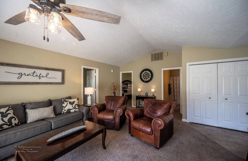"Around the Corner" is truly, around the corner from everything that Santa Claus has to offer. This 2 Bedroom, 2 Bath property has a large family room, outdoor grilling space, eat-In kitchen, and in-unit washer and dryer. The primary bedroom offers a large King Sized bed with upgraded linens and mattress along with an attached full bathroom. The second bedroom hosts a Queen bed with a Full Size trundle bed. In the Living Room, there is a pull-out sofa bed, a Queen Size air mattress and pack-n-play for all of your sleeping needs. The outdoor patio area provides seating and grilling space, where a gas grill has been provided. This unit can accommodate up to 11 guests. There is private parking for 2 vehicles in the shared driveway and additional, overflow parking on the South side of the Street. We have strived to make "Around the Corner" feel like a home away from home. We provide all bedding, pillows, blankets, towels, wash cloths, dishwashing detergent, dish cloths, utensils, pots/pans, cooking utensils and in unit laundry facilities (including detergent). We provide the basic amenities for a 2-3 day stay including two spare rolls of toilet paper per bathroom and one spare roll of paper towels. Starter coffee packs are included for your first morning (Keurig). If you are looking for convenience, you have found it, as we are within walking distance of Holiday World, the grocery store, Dollar Store, restaurants, liquor store and more. Close by, you can visit Lincoln State Park and Lincoln Boyhood National Memorial and learn about how Abraham Lincoln spent his formative years here in Spencer County. There you will find a lake, picnic areas, and even a living farm that replicates how Abe would have had to live and farm using only items from that time period. Lincoln State Park also hosts live music at their outdoor Amphitheater. Your family will be close to everything when you stay at this centrally-located property.