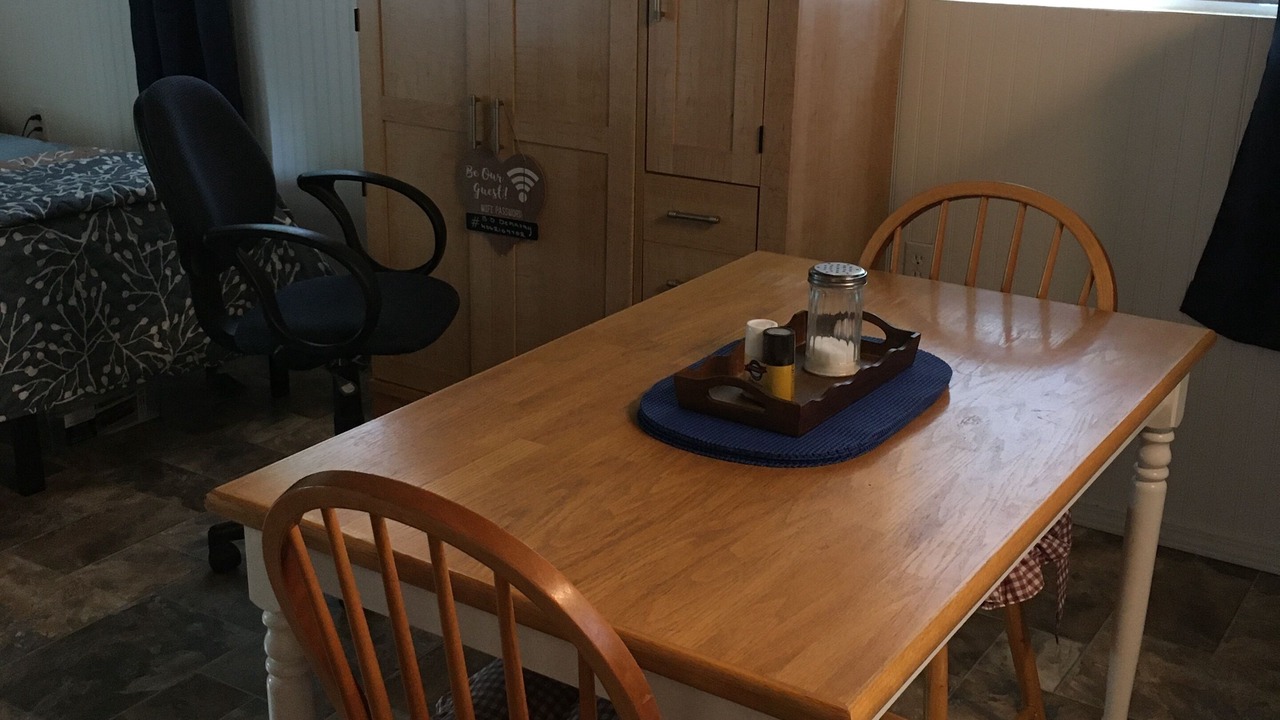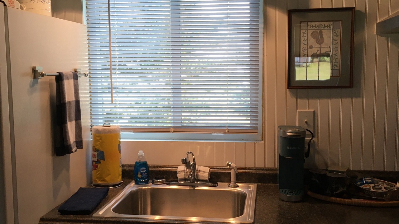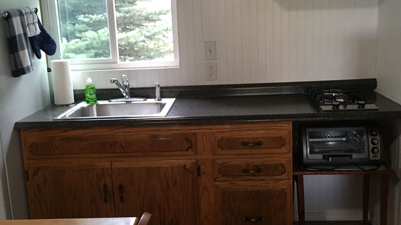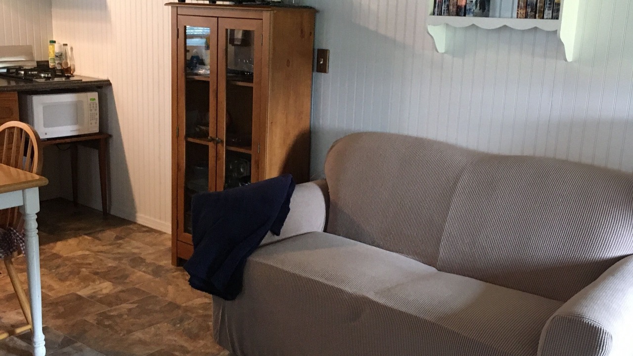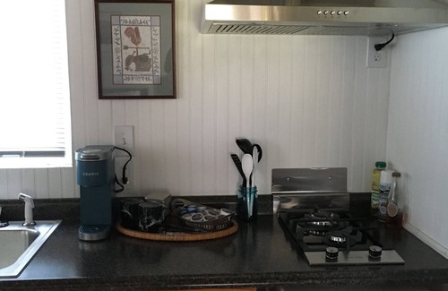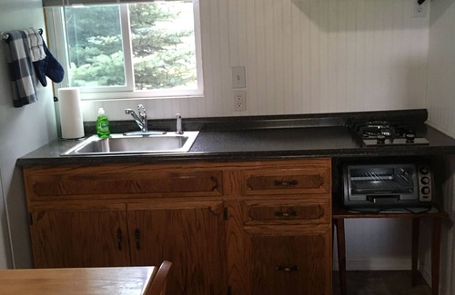 Small one-room cabin with almost complete cooking facilities. Cabin has queen bed, work-from-cabin set-up, dining table, loveseat, and separate bath house next door to cabin. Perfect, quiet location complete with fire pit and BBQ. Additional room on property often available to rent with it and/or sm. trailer available for extra sleeping quarters. Occasional small aircraft noise from take-offs and landings adjacent to cabin. Wildlife-deer, wild turkeys, other possible, and two in/out owner kitty cats on property to greet you. Lots of parking on property. Owners on property to greet you and assistance if needed, but otherwise do not bother interfere with your personal vacation and space. Guests love the quiet, dark nights and lovely calm, sunny days in a park-like setting for good relaxing vacation.