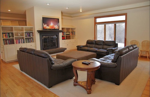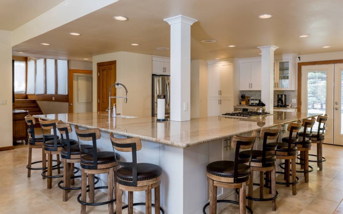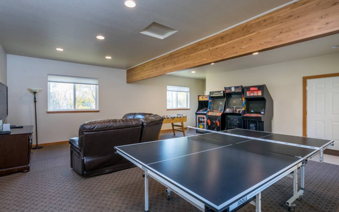 With 7 bedrooms and over 6,000 square feet of space, The Palace at Sun Valley, by Mountain Vacation Lodging, is hard to beat! The bedrooms, living rooms, the whole home has tasteful furnishings and great views of the surrounding mountains. You will notice the quality from the hardwood floors to motorized shades and beautiful fir trim. With 3 living rooms, 2 kitchens, 2 dining rooms, game room, and 7 bedrooms allow large groups spread out, yet the main living room, dining room, and kitchen are large enough to accommodate most or all of your party. 2 kitchens allow 2 to 4 chefs to whip up an amazing feast for all to enjoy. The formal dining tables in the main area seat 14, and there is bar seating for 9 more. When you have a kitchen island with bar seating for 9 people, you know you have a large space! The second full kitchen has bar seating for 4 and formal dining for 6. With all this space, you can get everyone together, or split them up, whatever you prefer! The main living room has 3 full size couches, and yet not one of them is backed up to a wall. This is a great place to relax by the fire with a book from the library, or watch the big game on the HDTV. Speaking of games - don't forget about the game room! In addition to the 3 living rooms, the game room is ideal for entertainment. It has an assortment of arcade games, a foosball table, ping pong table, and 70 inch TV with video game systems and associated games, controllers, etc. The kids will love this room, but don't be surprised if you find some adults having a blast here too!