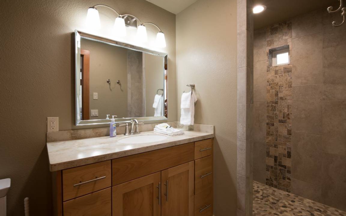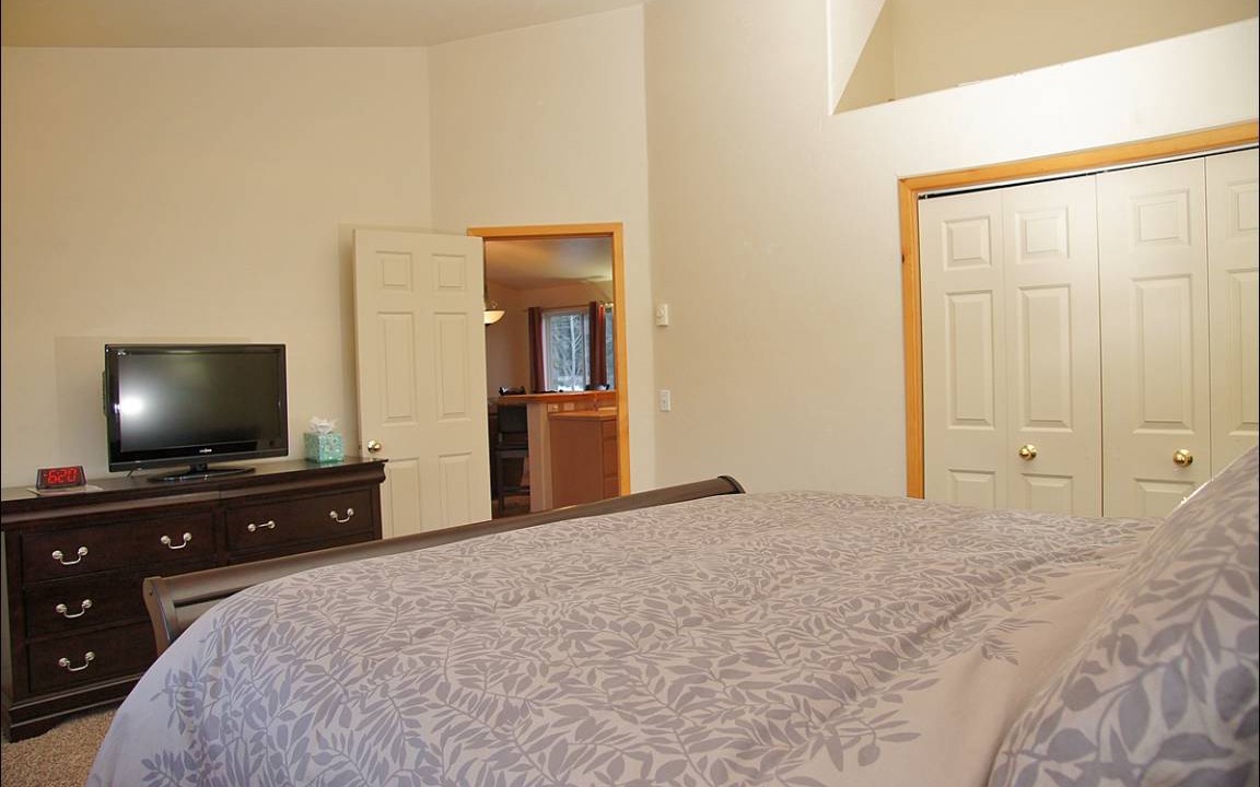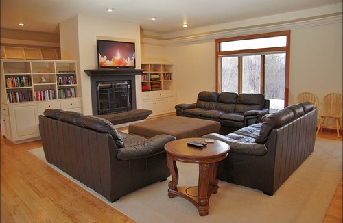 On the north wing of the home, the master suite is fit for a King or Queen. This suite has 3 rooms and features vaulted ceilings, an HDTV, and patio. The main bedroom area is so large it makes the King bed look small. French doors lead into the dressing room, and another set of french doors open into the master bath.. The master bath is a 5 piece bathroom which includes a long bathtub, a large steam shower, water closet, and vanity with dual sinks. The second master bedroom is upstairs. Again the room is more than ample for the King bed and nightstands. This 2nd floor room has extra nice views of the mountains, as well as an HDTV and private bathroom. The third master bedroom is actually a whole apartment! The private bedroom has a King bed, vaulted ceilings, HDTV, and great views. Then you have the living room with beautiful leather sofa, HDTV, full kitchen, and dining area. The bathroom for this apartment features granite counters, a walk in shower, and water closet. Bedrooms 4 and 5 are separated by the 3rd living room, which again features a beautiful leather sleeper sofa as well as a fireplace and HDTV. Bedroom 4 has a King bed, gas fireplace, and HDTV while bedroom 5 has 2 bunk beds, 4 Twins overall. These two bedrooms share a full bath which features an iron claw tub and shower. Upstairs, bedroom 6 has a Queen bed and HDTV while bedroom 7 has 2 Twins and an HDTV. Both have great views and they share a nice large full bathroom.