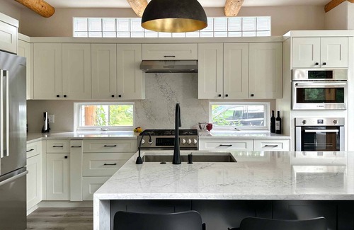 This 3400 square foot, beautiful and spacious home includes a master suite on the first floor, with 4 bedrooms on the second floor: 2 with king beds, luxurious bathrooms and big closets. A 3rd upstairs king bedroom has a large walk in closet and a double vanity in the full bathroom. There is also a queen bedroom with adjacent clawfoot tub bathroom, and another bedroom has 2 extra long twin beds. Three of the 4 bathrooms have radiant heat. There is a 2 car garage and driveway parking for 5 other vehicles.