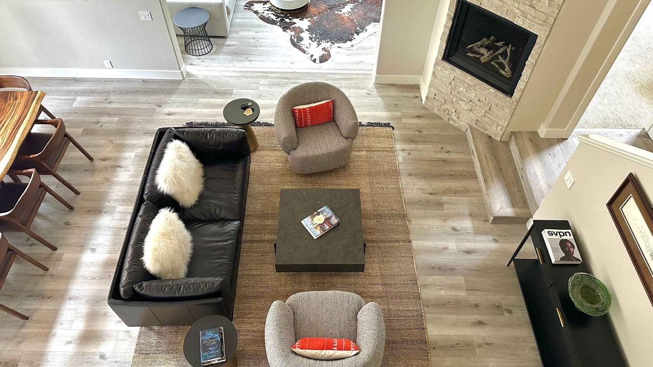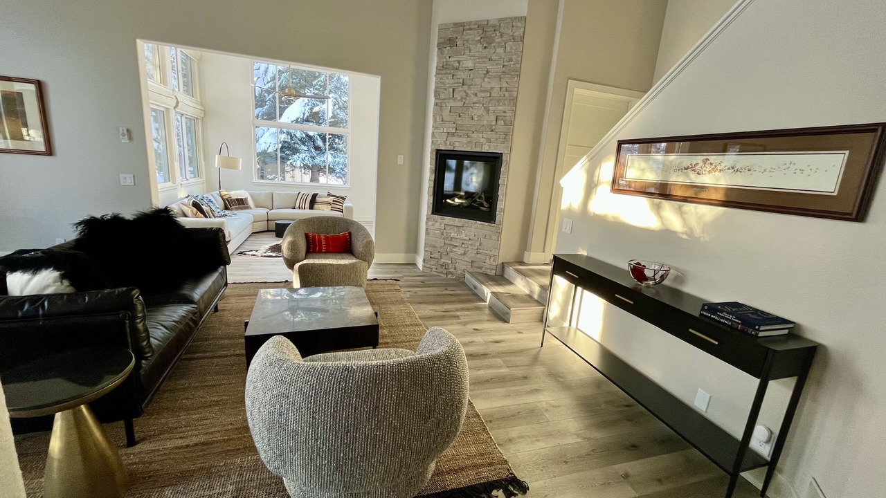 The main level includes a fully stocked kitchen with new appliances (dual fuel oven/range, wall ovens, wall microwave, dishwasher, and refrigerator), washer/dryer, and immediate hot water dispenser. The remainder of the 1st floor includes a breakfast area, dining room, living room (with gas fireplace), lower living room (with 75 inch TV), office, powder room, laundry room and 4 seat island.