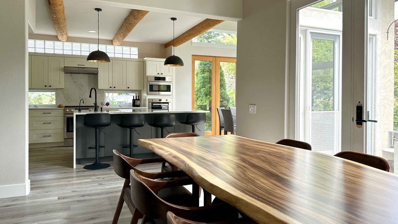 There are high ceilings throughout most of the house, with dramatic floor to ceiling windows, that let in an abundance of natural light.