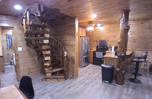 Leave your worries behind and come enjoy the great outdoors while staying in the BRAND NEW Arrowhead A frame cabin located on our sprawling Rocky Prairie Ranch overlooking the Buffalo National River Valley in the distance. We are conveniently located off Hwy 333 just under one mile from Hwy 65. With multiple points of access to the Buffalo National River, only minutes away from the cabin, along with three canoe outfitters to choose from. The Arrowhead A frame is a great choice for families that are wanting to enjoy the Buffalo River and all the fun activities of the surrounding Ozark mountains. The cabin features an open floor to ceiling living room with large stunning glass windows looking out towards the mountains and countryside. In the living room, you will find many seating options from a futon sleeper sofa, love seat, papasan chair and more while enjoying the smart TV with streaming apps and a DVD player with 100+ movies to choose from. Also, below the TV is a 50 inch LCD electric fireplace capable of many color and speed settings great for creating that mountain cabin ambience. Moving into the kitchen and dining area you have two options for dining either at the bar or dining table, each have seating for four. Both of which are made from trees milled right from the Ranch as you will find throughout the cabin . The cabin has a full kitchen with all necessary cookware including range/ oven, refrigerator, dishwasher, microwave, toaster, and Keurig Kcup coffee maker with a selection of coffee provided. Moving into the master bedroom you will find a plush queen bed along with two nightstands, a dresser, and a closet. Connecting to the master is the main bathroom, which has a custom walk-in shower with a large rain shower head for a relaxing experience. To the side of the main bathroom there is a washer and dryer, convenient for those on longer stays or as the need arises to do laundry. Going up the spiral staircase you will arrive in the upstairs bedroom/loft with adjacent half bath. The loft has been designed with four built in bunks, two of which are full size mattresses and two are twin size. Each bunk has their own animal themes. Each bunk has its own cubby, lights, and power outlets including USB outlets for charging devices. From the loft there is a balcony overlooking the living room and perfectly positioned to peer through the glass of the A frame looking out to the mountains to the east which lays the Buffalo National River. Awesome sunrises may also be seen through the large front windows with the cabin positioned due east. Due to all of the custom woodwork in cabin, we do not allow pets. Going outside you will find a front deck with seating that is elevated 6 feet above ground level providing spectacular views. This area of Arkansas and the Buffalo River has also been deemed an International Dark Sky Park, which affords you some breathtaking views of the stars right from the front deck of the cabin. On the back deck you will find a ramp for ease of access to the cabin for those that don't like stairs. Leading off the back deck is a pathway that leads to the firepit area. Large thousand pound boulders make up the seating area around the fire pit with the added seating option of a rustic wood slab top picnic table. Provided also is a propane gas grill for cooking burgers or such. The driveway to the cabin is a well cared for gravel driveway with multiple parking spots in front and beside the cabin. There is plenty of room for trailers also if needed.