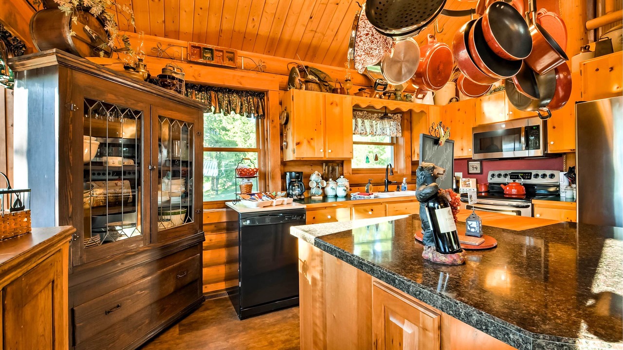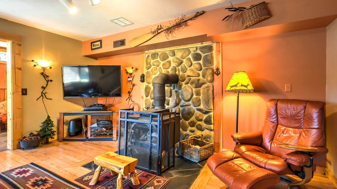 INDOOR LIVING: Wood-burning stove (wood provided) w/ stone wall-surrounding, mountain-themed furnishings, 65-inch flat-screen Smart TV, 30-inch flat-screen Smart TV, Blu-Ray player, streaming capability, Bose stereo system, CD & DVD collection, Wii console w/ video games, electric fireplace, exposed wood beams, deer antler chandelier