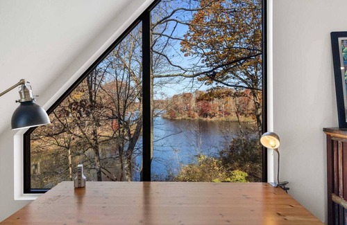 Built as a private retreat for busy artists, "Art Docko" does not disappoint! All three levels of this spacious home are surrounded by windows that fill the house with dappled sunlight. The many quiet corners and meditative views make this a serene place to curl up with a book or write your own. Unwind around the fire pit with a glass of wine and panoramic views of the lake, or enjoy a swim from your private dock. WiFi is fast, so it's easy to stream or Zoom.