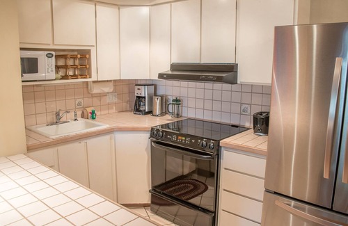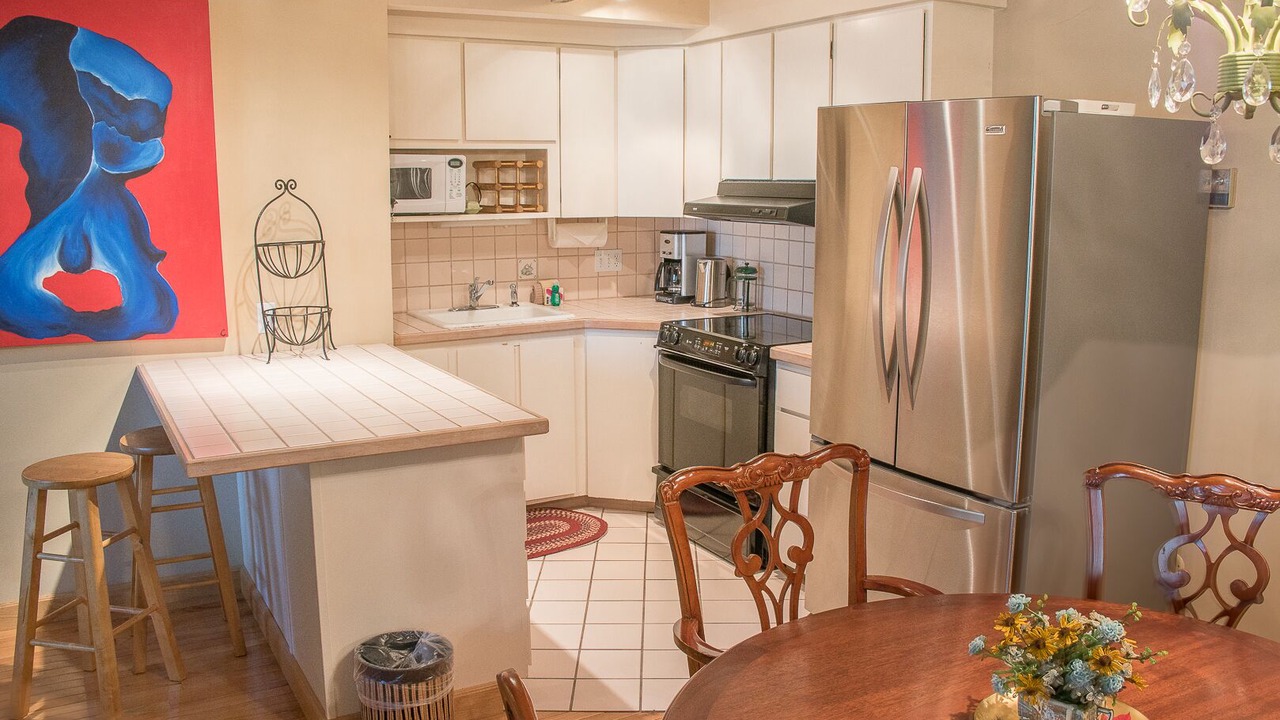 This ground-floor corner 2 bedroom/ 2 bath condo is located in the Sun Valley Village. Condo offers approx. 1000 square feet of living space and will sleep up to 5 guests. The living area has a 65-inch flat-screen TV with cable and streaming, a single-size sofa bed, and complex views. The kitchen is fully furnished and the dining table seats 4.