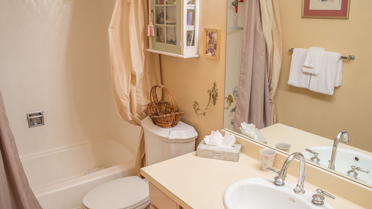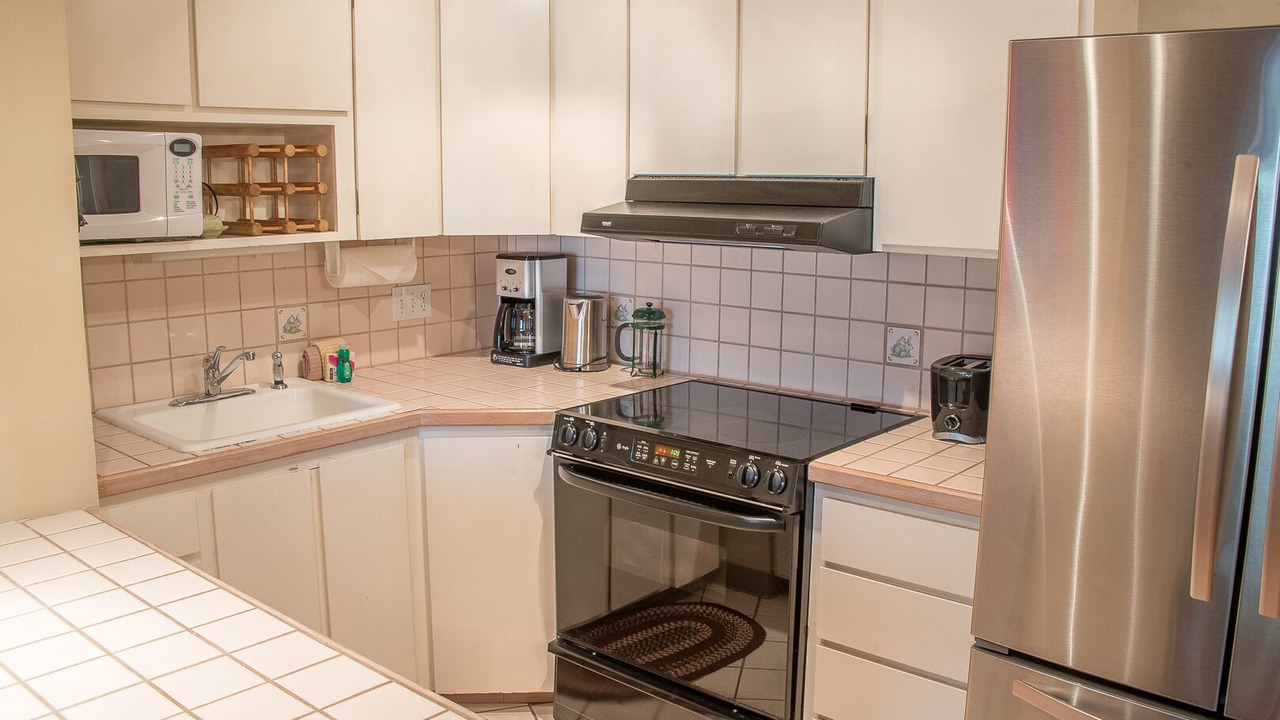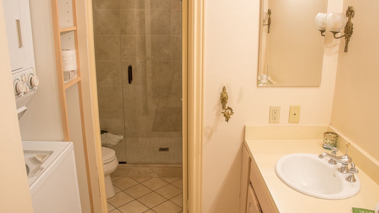 The master bedroom has a Queen bed, a 32-inch flat-screen TV, and complex views. This room has access to a full-size hallway bath with tub/shower combo and single vanity. The second bedroom has a Queen bed, desk, 32-inch TV, and complex views. This room has access to a hallway bath with a shower only, and a single vanity. There is a stack washer/dryer in this bathroom.