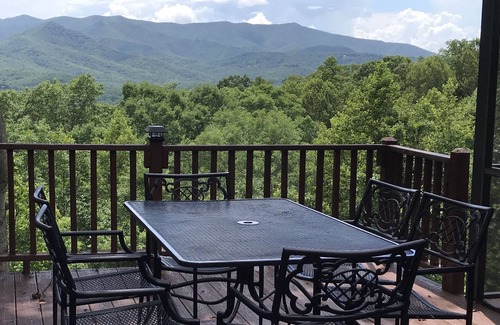 Brown Bear Hideaway is very convenient to downtown, only 2 miles from the middle of Hiawassee, Georgia. The drive is very easy to the home and is paved road. The home sits on a private lot with many trees. A flat driveway and only a four steps to the main level of the home where you will find a living room, kitchen, 2 bedrooms, a queen, 2 twins and a full bathroom between. The sofa makes into a sleeper. A wood burning fireplace for cool nights. Enjoy an oversized large screen porch with a year round fantastic 30+ mountain peak view of the Appalachian Mountains and the National Forest. See the tallest point in Ga, Brasstown Bald from the deck. An outside dining table that seats 6 for meals outside with a view. The lower level of the home has another bedroom, a king, full bathroom, living room with seating and a 50" TV, foosball table, full bathroom and outdoor screened patio area 2 oversized rockers and a picnic table. A door leads to a lower yard with a fire pit. The home is furnished with a full kitchen, linens and has log beds and a mountain theme decor. Charcoal grill available next to a firebowl near the parking area and plenty of seating. Covered parking available. We know you will love the location, privacy and peaceful surroundings of Brown Bear Hideaway Just 25 minutes to Helen Ga and 7 minutes to downtown Hiawassee, Georgia.