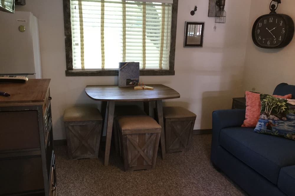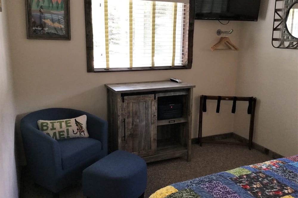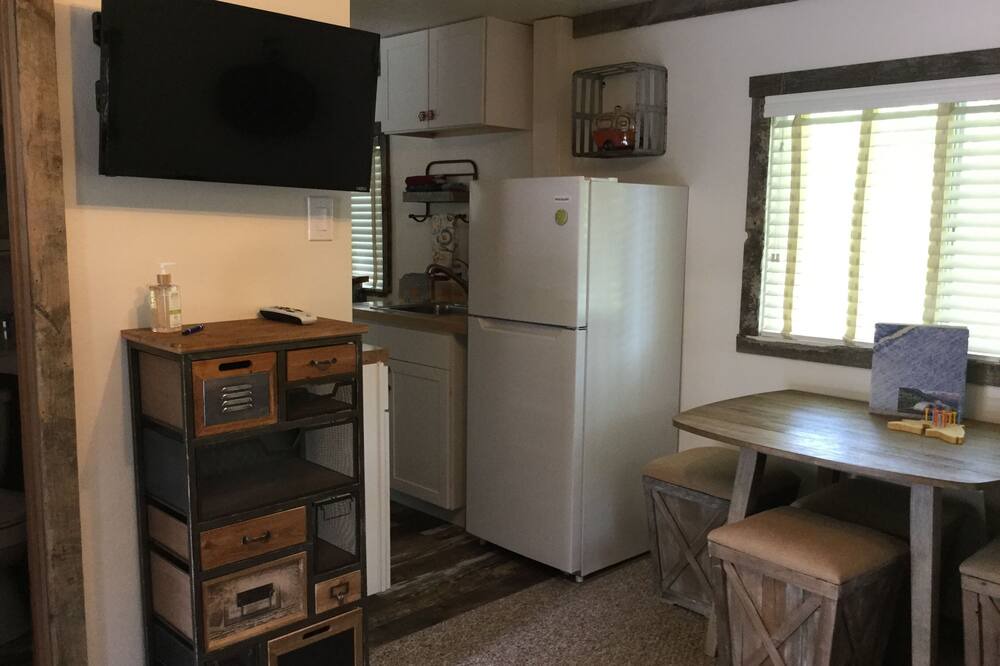 1 of 6 Studio cabins this one with a queen bed and full size sofa sleeper. a small kitchenette seperates the bedroom and living area. Private bath and shower with 2 flat screen cable TVs and electric fireplace.