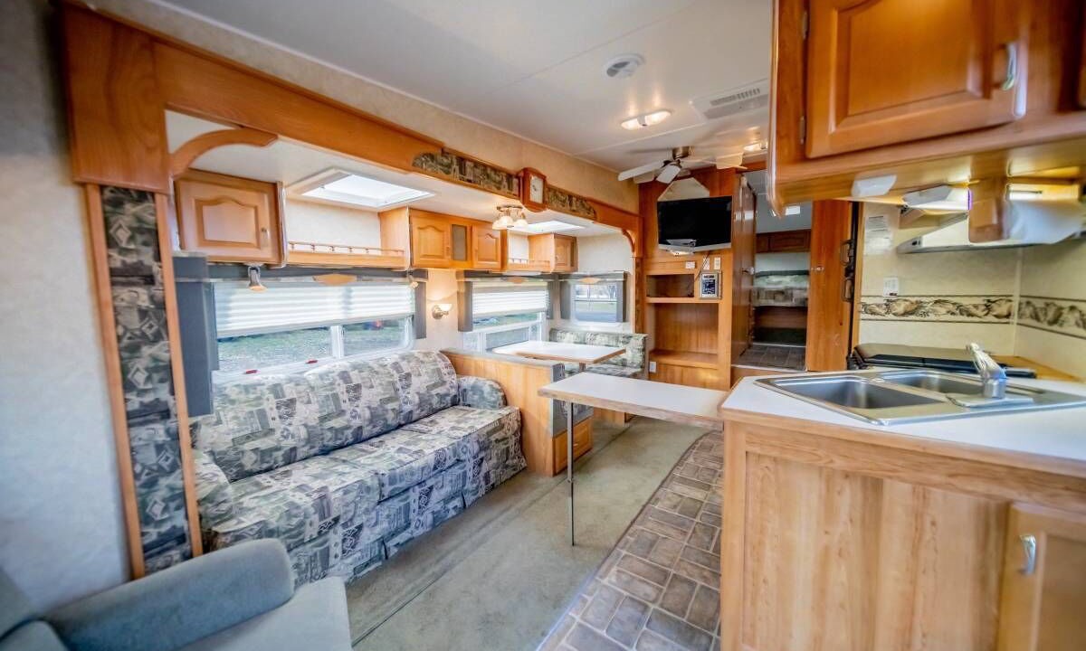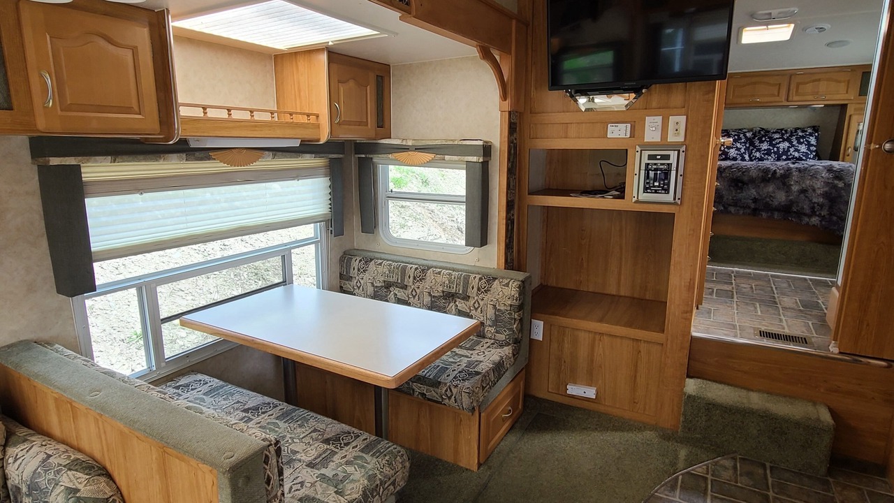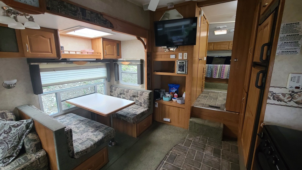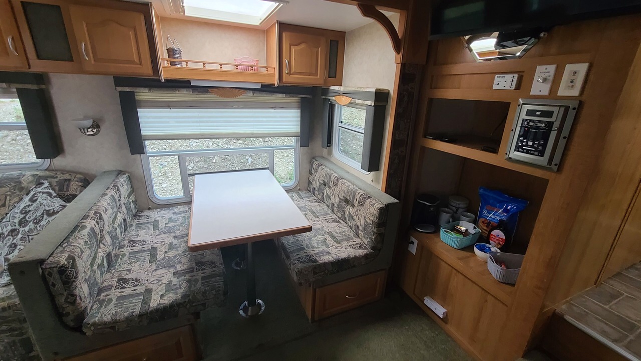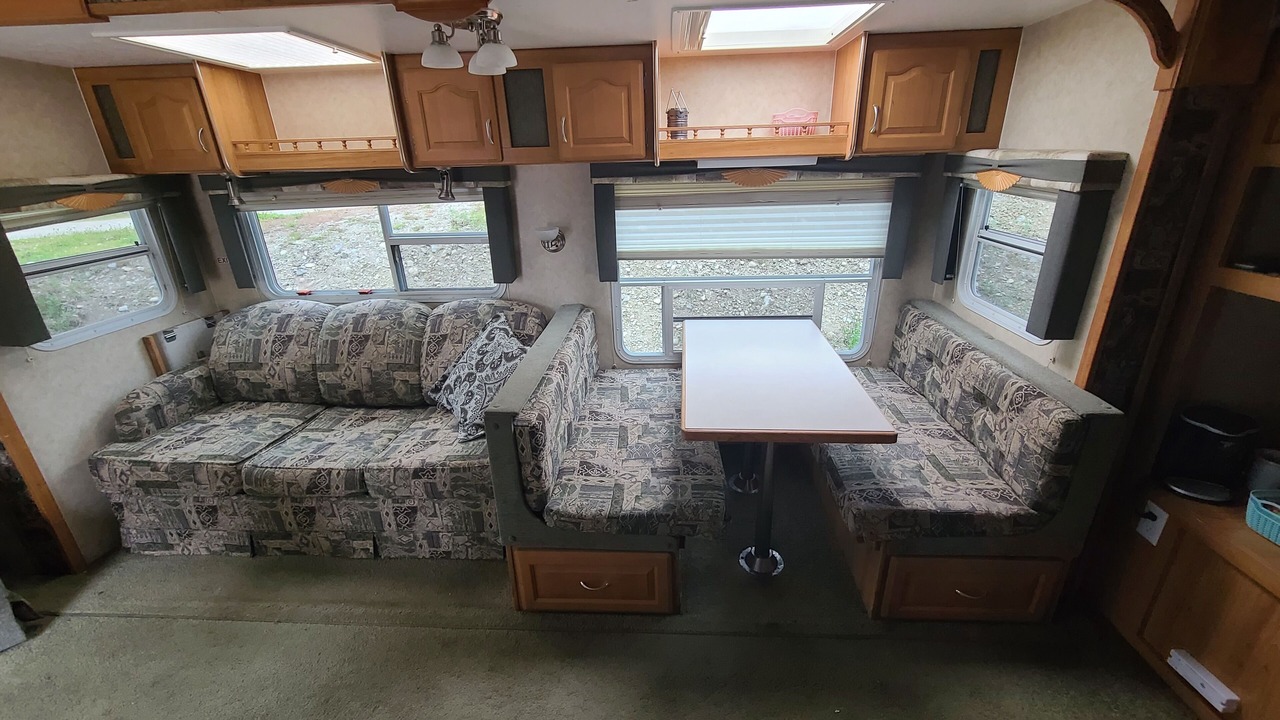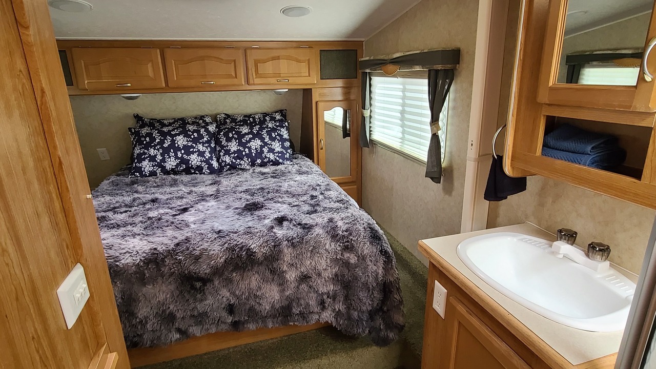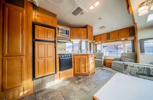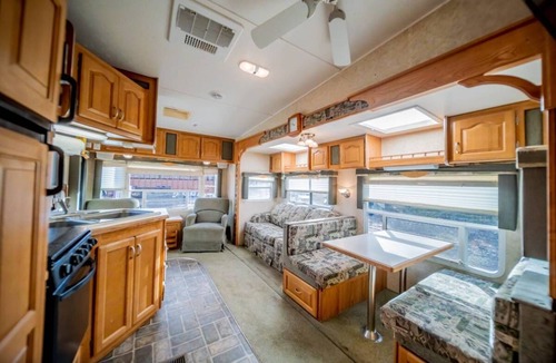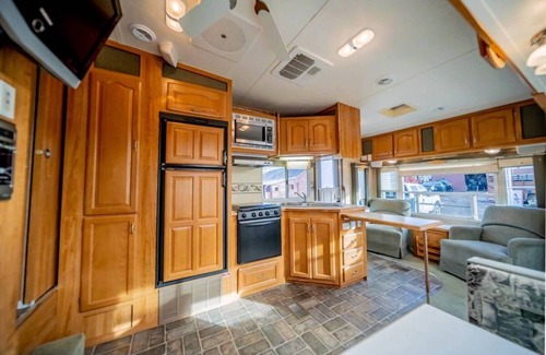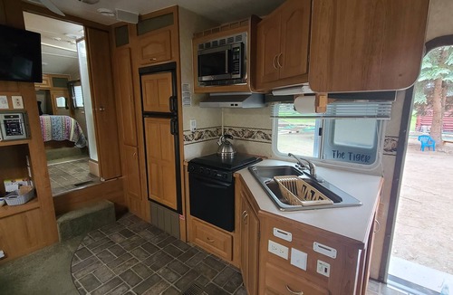 Our TIGER Camper features a Queen size Master Bed, a small couch & a small convertible dinette booth/bed. It stays nice & warm with a propane furnace via floor vents plus plenty of soft blankets and pillows to snuggle up with. There is a Smart TV and wifi connection. You'll also have a complete Bathroom with a shower, as well as fresh towels & some soaps if you need them. You'll find the kitchen cabinets well stocked with all the basics you should need to prepare meals. This camper has a big living room area slide-out which make it feel more spacious.