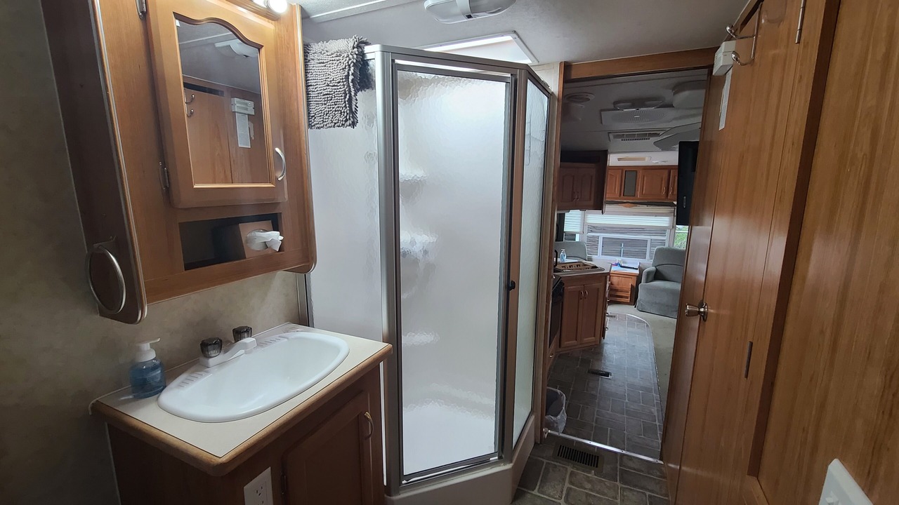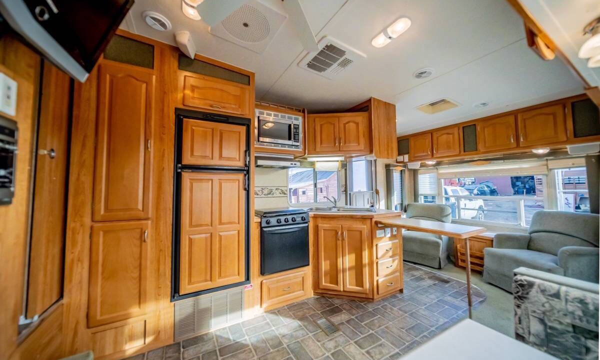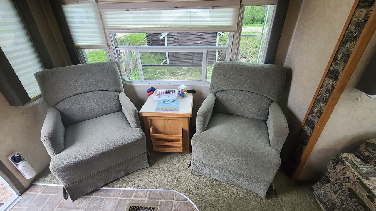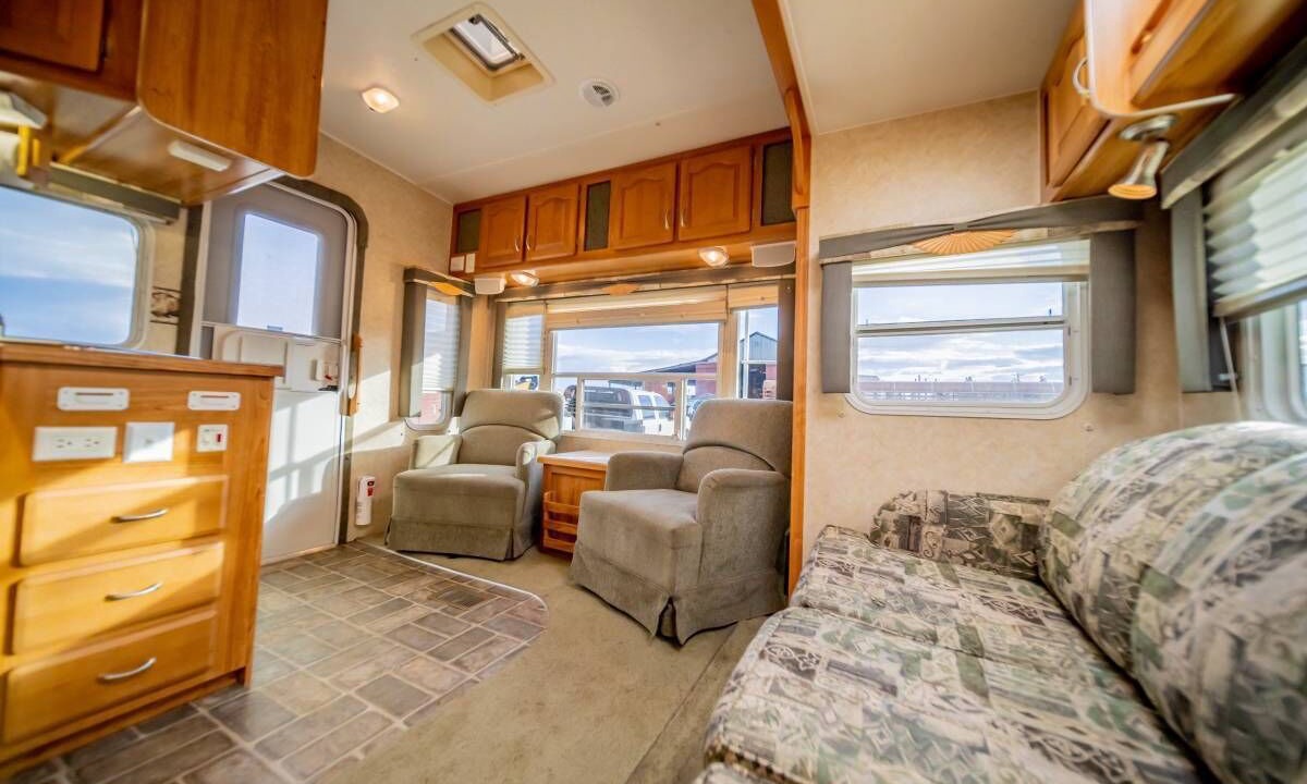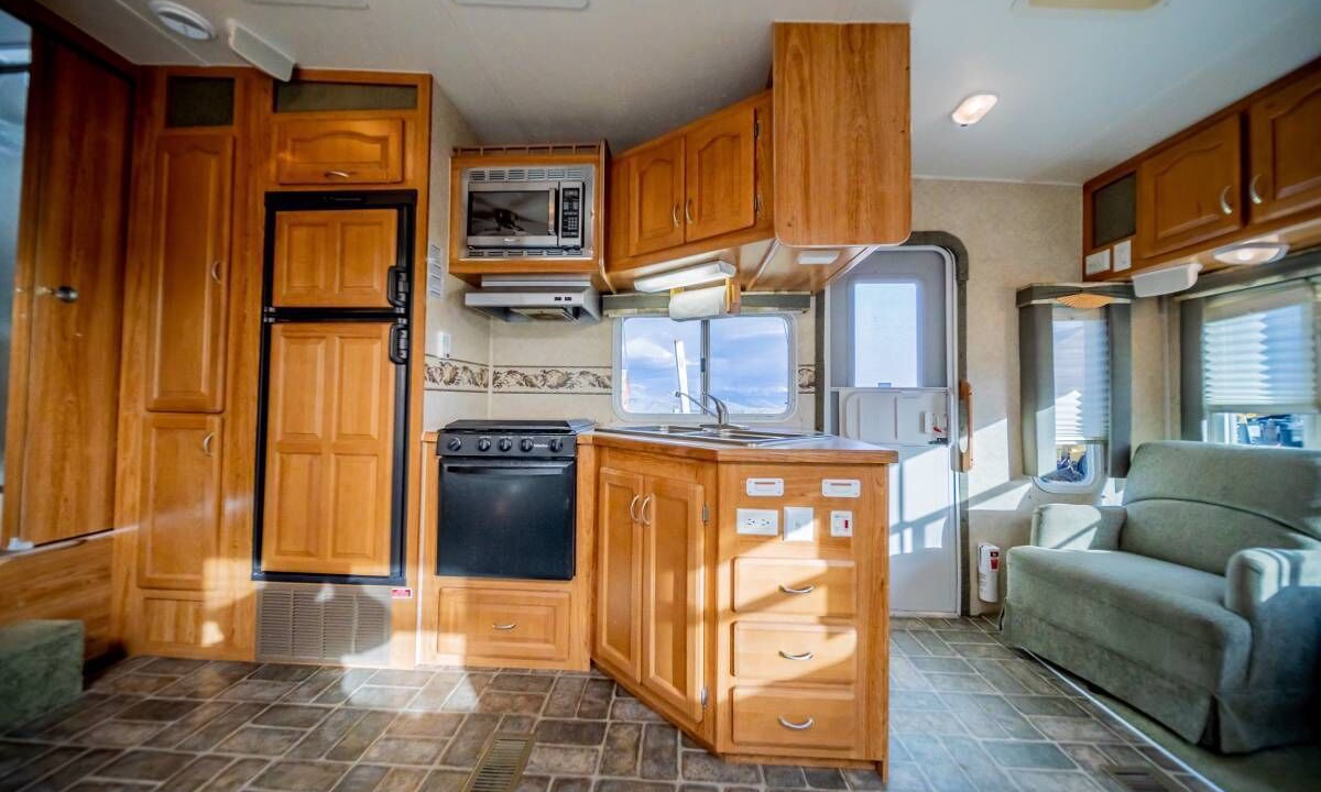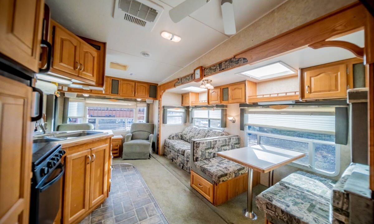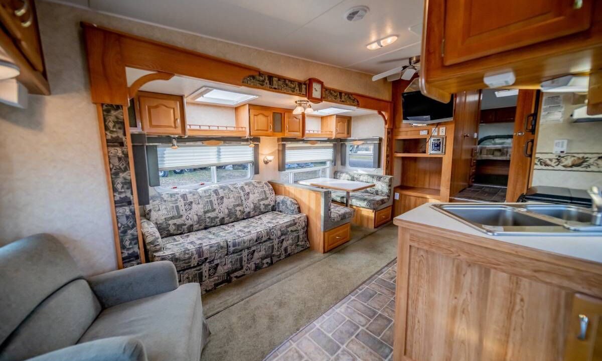Our TIGER Camper features a Queen size Master Bed, a small couch & a small convertible dinette booth/bed. It stays nice & warm with a propane furnace via floor vents plus plenty of soft blankets and pillows to snuggle up with. There is a Smart TV and wifi connection. You'll also have a complete Bathroom with a shower, as well as fresh towels & some soaps if you need them. You'll find the kitchen cabinets well stocked with all the basics you should need to prepare meals. This camper has a big living room area slide-out which make it feel more spacious.