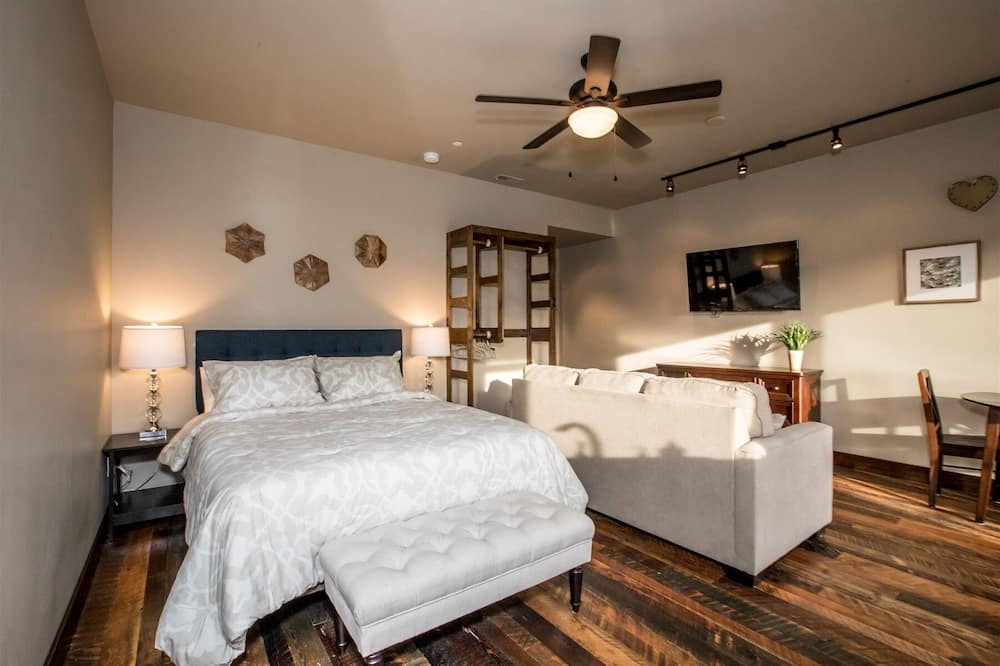 This delightful studio has everything guests need! Guests step into an open bedroom, kitchen, and living area with views of downtown. A queen bed and full sleeper sofa face a wall-mounted TV and a kitchen with a 5-burner gas range, granite countertop, mini fridge, and microwave. A shared bathroom has a shower/tub combo, and a washer and dryer are provided for convenience. Guests may dine at a cozy dining table that seats 2 or step out sliding glass doors and dine alfresco on the balcony while enjoying mountain and downtown views.
