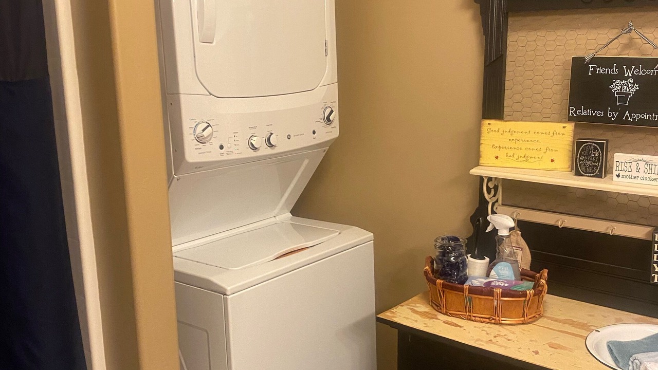 The apartment includes a stacking washer/dryer, full kitchen with refrigerator, free standing oven, cook top, dishwasher, garbage disposal, Keurig coffee machine, toaster, George Forman Grill, blender, hand mixer, rice cooker, 60 inch TV in main room with Amazon Fire Stick, small TV in master bedroom with Amazon Fire Stick. Non smoking/vaping.