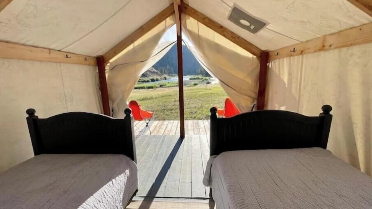 Experience the ultimate mountain escape in our Safari Tents, nestled in the heart of the Salmon Challis National Forest, directly on the banks of the scenic Salmon River in Idaho. Our fully equipped tents offer a hassle-free adventure with a comfortable bed with fresh linens, a lockable storage trunk for your belongings, and a cozy porch to relax and take in the breathtaking surroundings. The shared bathroom and shower house are just a few steps away for your convenience. Join us for adventure!