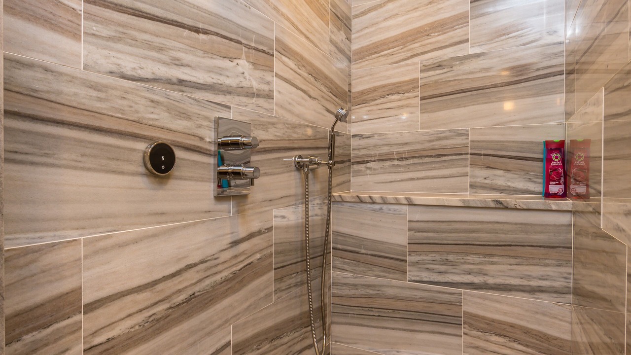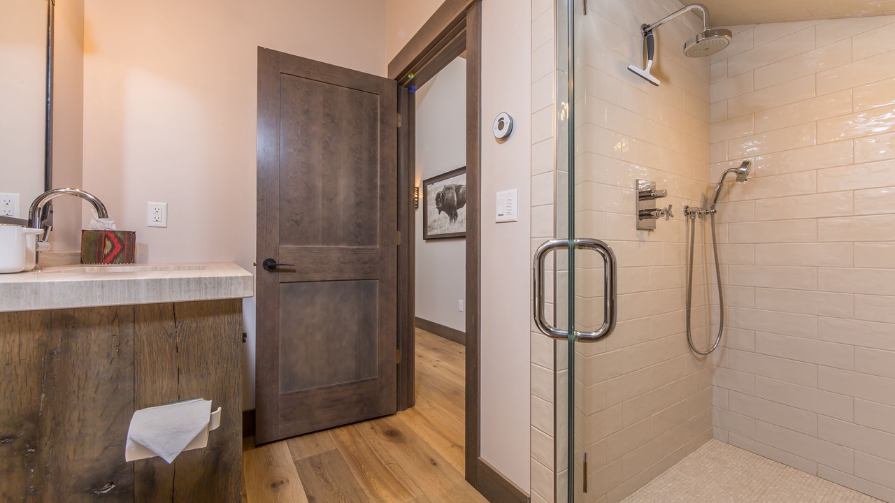 Guest Bedroom with Queen Bed and En Suite with single vanity and walk-in steam shower