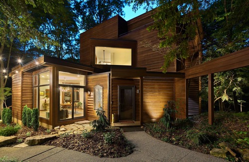 This spacious home features a unique modular design, creating the illusion of individual luxury cabins slotted together. Within the striking wooden structure, you’ll find five spacious bedrooms, three of which boast direct patio access so you can step outside to sip your morning coffee while listening to the breeze whispering through the leaves. The three top-level bedrooms are accessed by a stylish spiral staircase. Wherever you choose to lay your head, you’ll find each bedroom a comfortable, stylish retreat from the hustle and bustle of city life.