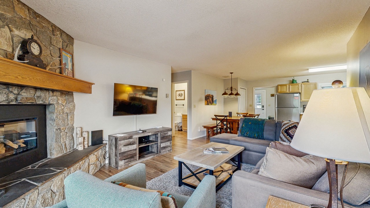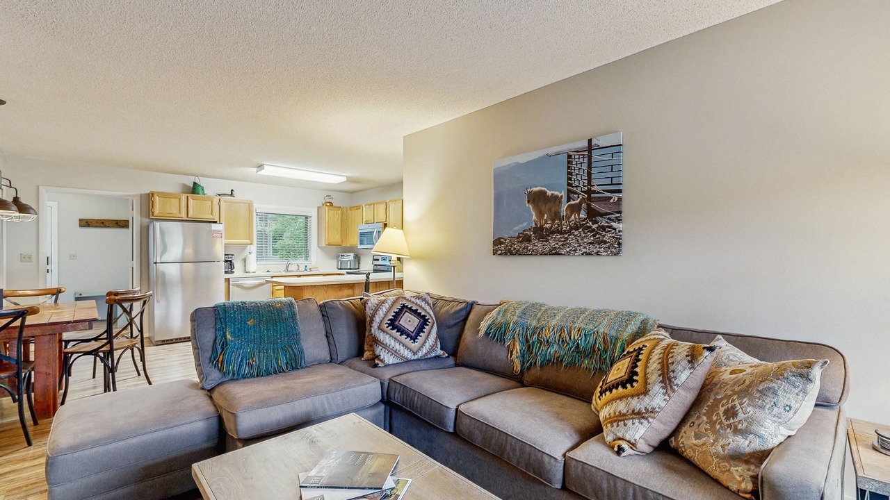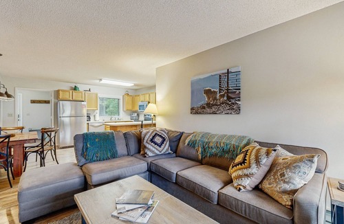 This mountain condo located in Big Sky's Mountain Village is 1000 square feet and has two bedrooms and two bathrooms. Condo highlights include budget-friendly rates with ski access and complimentary wireless internet. Once you enter up two stairs, the condo is all on one level. The kitchen, dining area, and living room are all open to each other, making it easy to hang out with everyone in your group after a day of skiing or hiking.