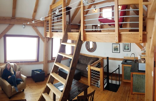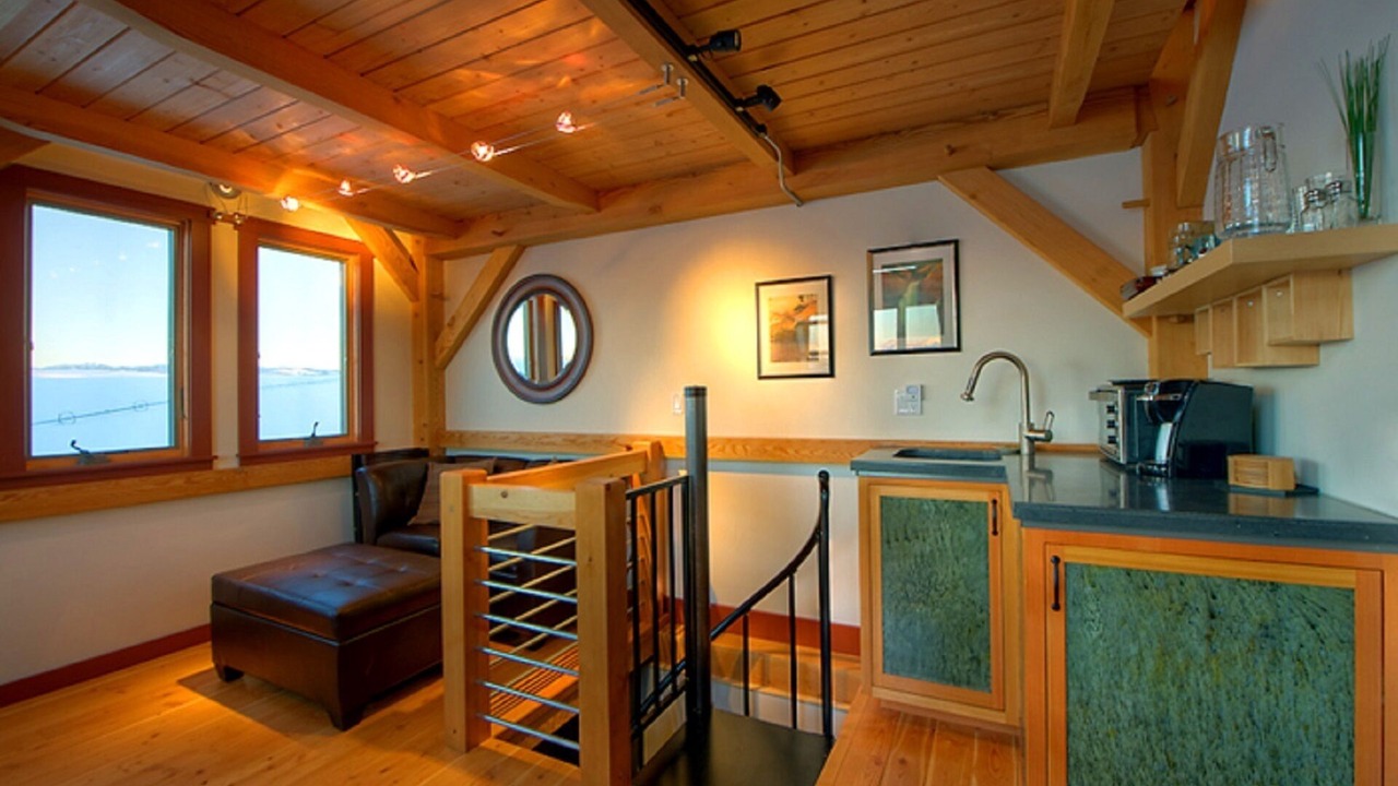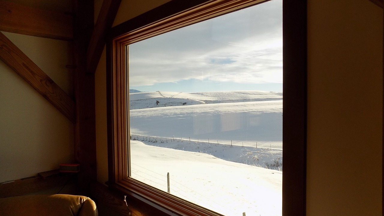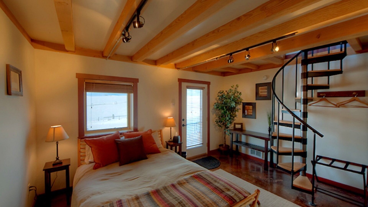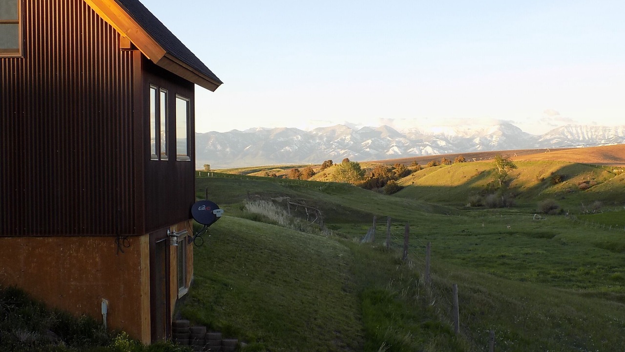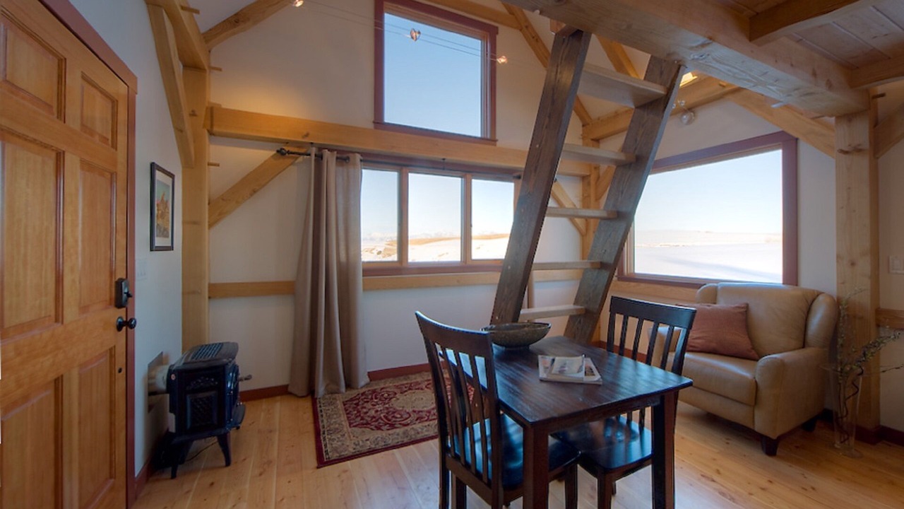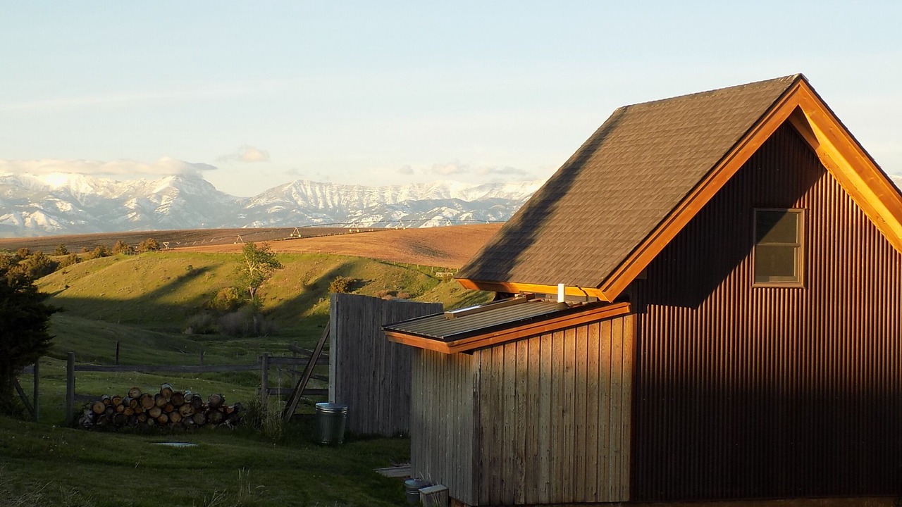 Our guest house is a highly energy efficient timber frame, with exposed beams throughout. The custom cabinetry, hand-poured concrete countertops, and spiral staircase are just a few of the creative touches that add to its incredible character. You will also enjoy amazing views of the Bridger Mountains, Spanish Peaks, and the beautiful rolling hills and farm fields that surround you.