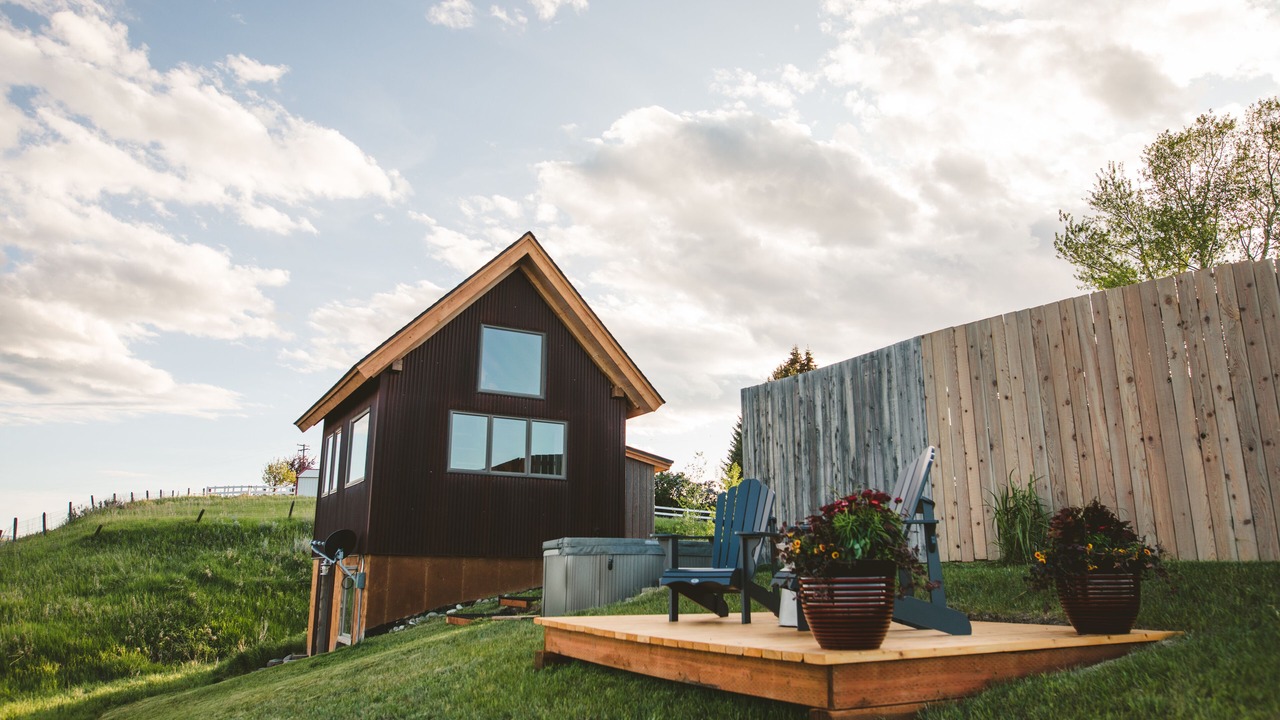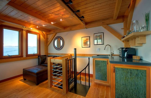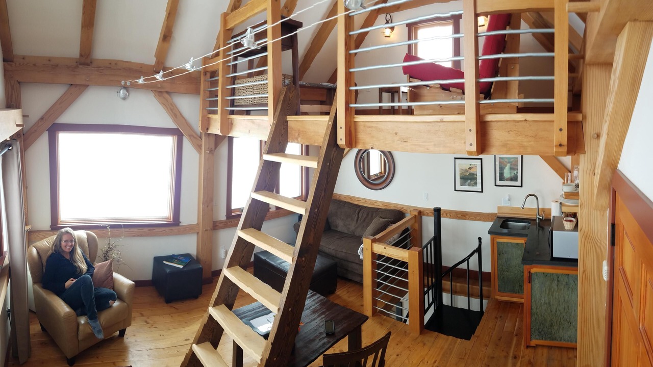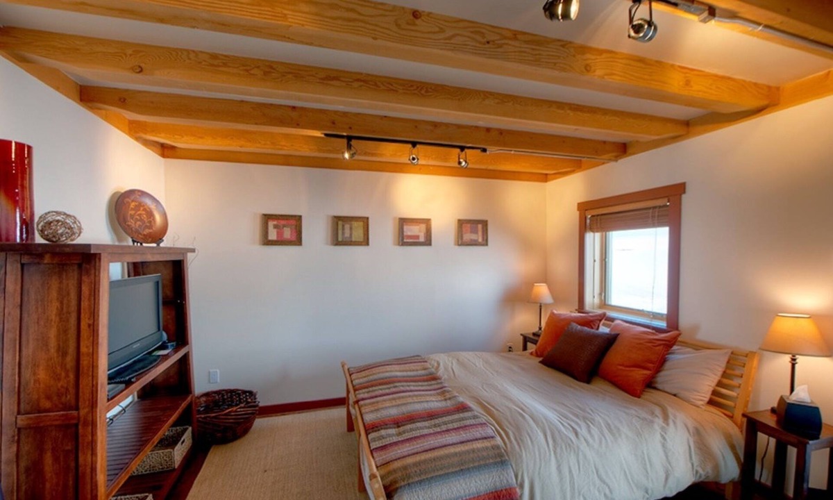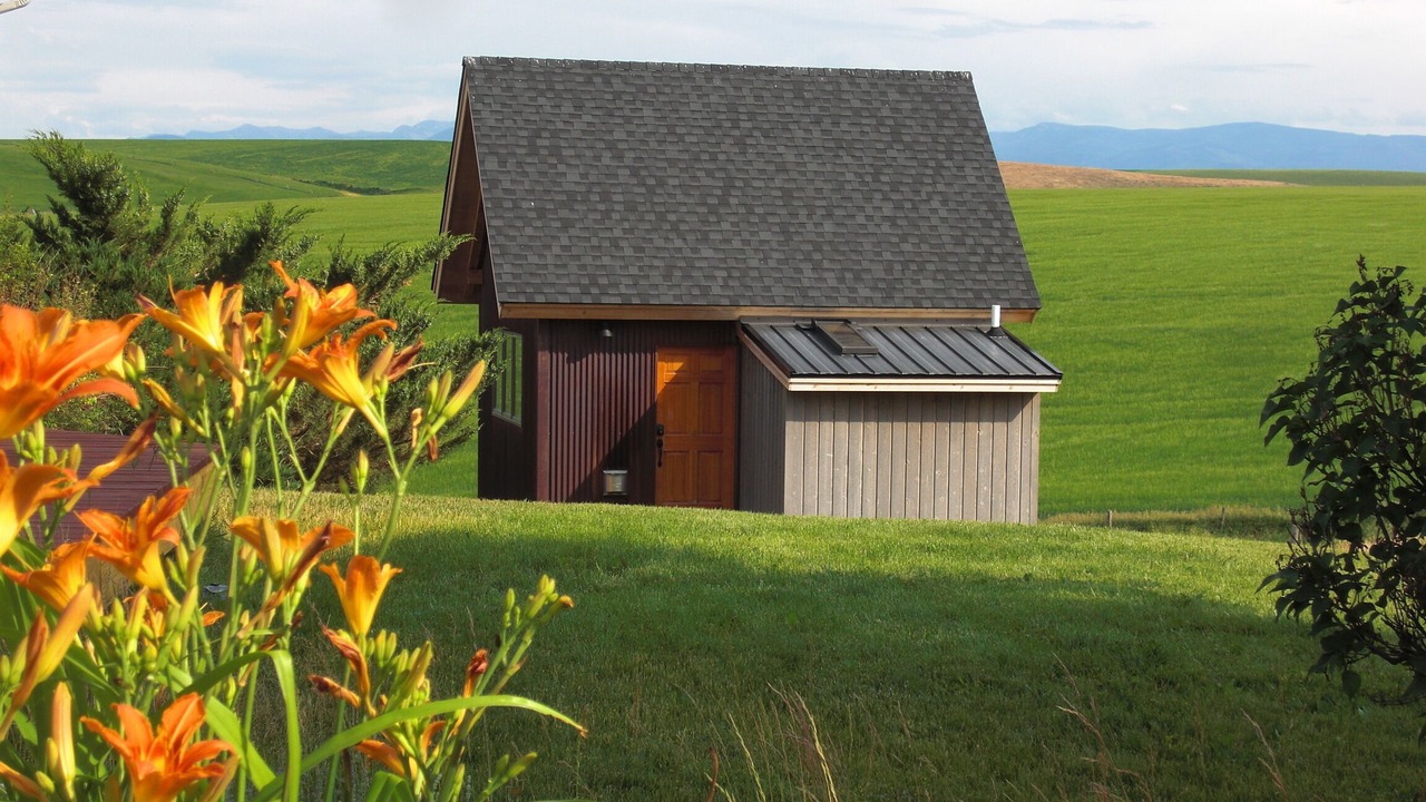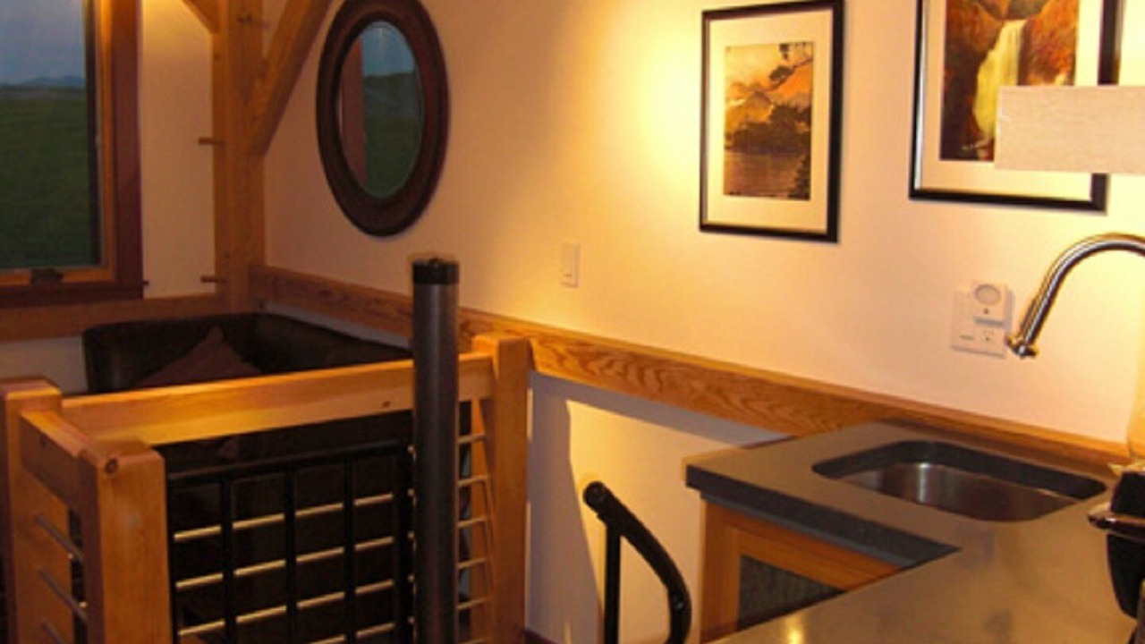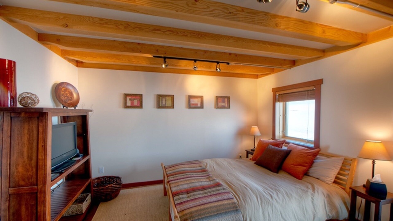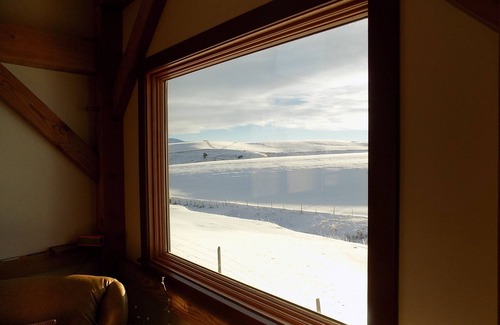 Our guest house is a highly energy efficient timber frame, with exposed beams throughout. The custom cabinetry, hand-poured concrete countertops, and spiral staircase are just a few of the creative touches that add to its incredible character. You will also enjoy amazing views of the Bridger Mountains, Spanish Peaks, and the beautiful rolling hills and farm fields that surround you.