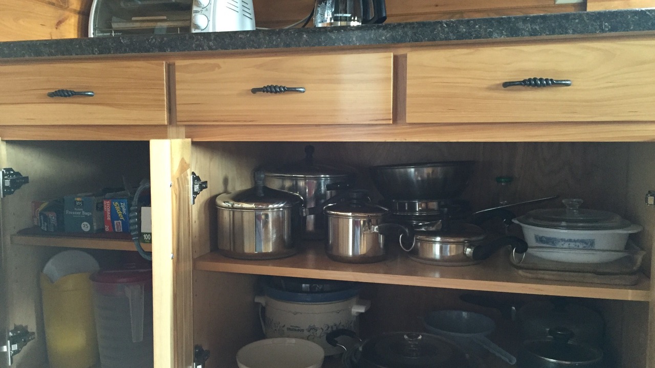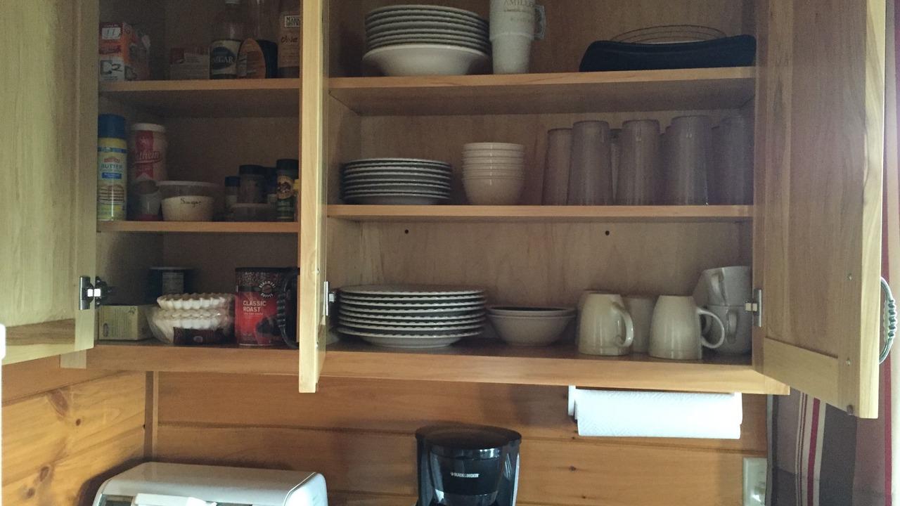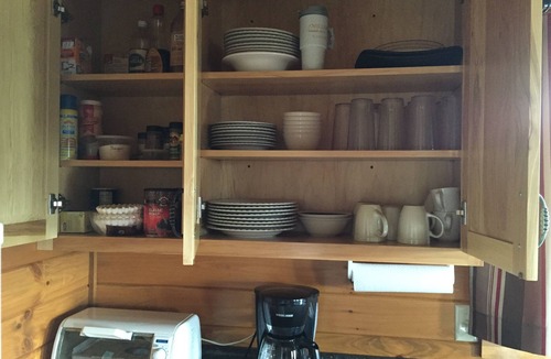 The kitchen is fully furnished with stove, oven, fridge, microwave, toaster oven, drip coffee maker, crockpot, pots and pans, dishes, cups, flatware, utensils, etc. Iron and small ironing board.