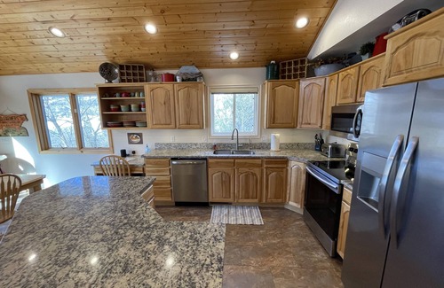 After an action-packed day spent exploring Idaho’s great outdoors, return to 'The Hideout' to cook a delicious meal in the fully equipped kitchen, which is complete with all the culinary appliances you’ll need to bring your favorite recipes to fruition. When dinner’s ready, gather around the large wooden dining table, with seating for 8, to devour the tasty home cooked fare. Additional barstool seating can be found at the kitchen island, ensuring that there’s room for everyone in your travel party to enjoy meals together.