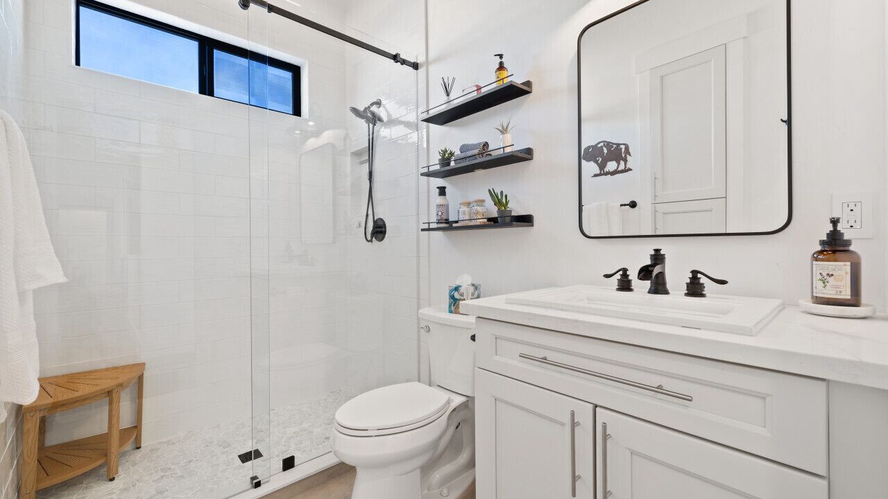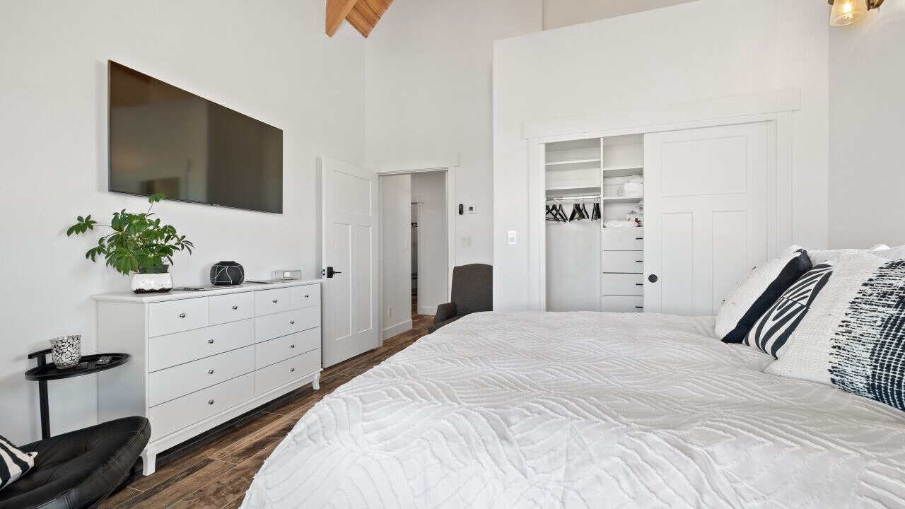 The primary bedroom boasts a king bed and an en-suite bathroom with a luxurious soaker tub. There are also two additional guest rooms, each with a queen bed, and a shared full bathroom. This home comfortably sleeps 6 people.