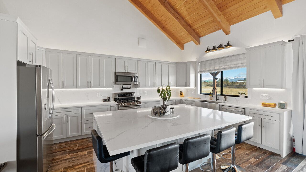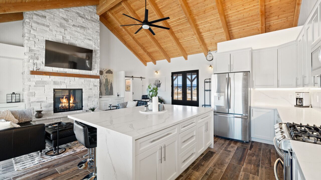 Inside, you`ll find a comfortable living space with a cozy propane fireplace, providing all the warmth and charm of a wood-burning fireplace without the hassle. Relax on the plush sofa and watch some TV after a day of exploring the great outdoors. The sleek modern kitchen is fully equipped for your entertaining needs, with stainless steel appliances, barbeque and a breakfast bar that seats six.