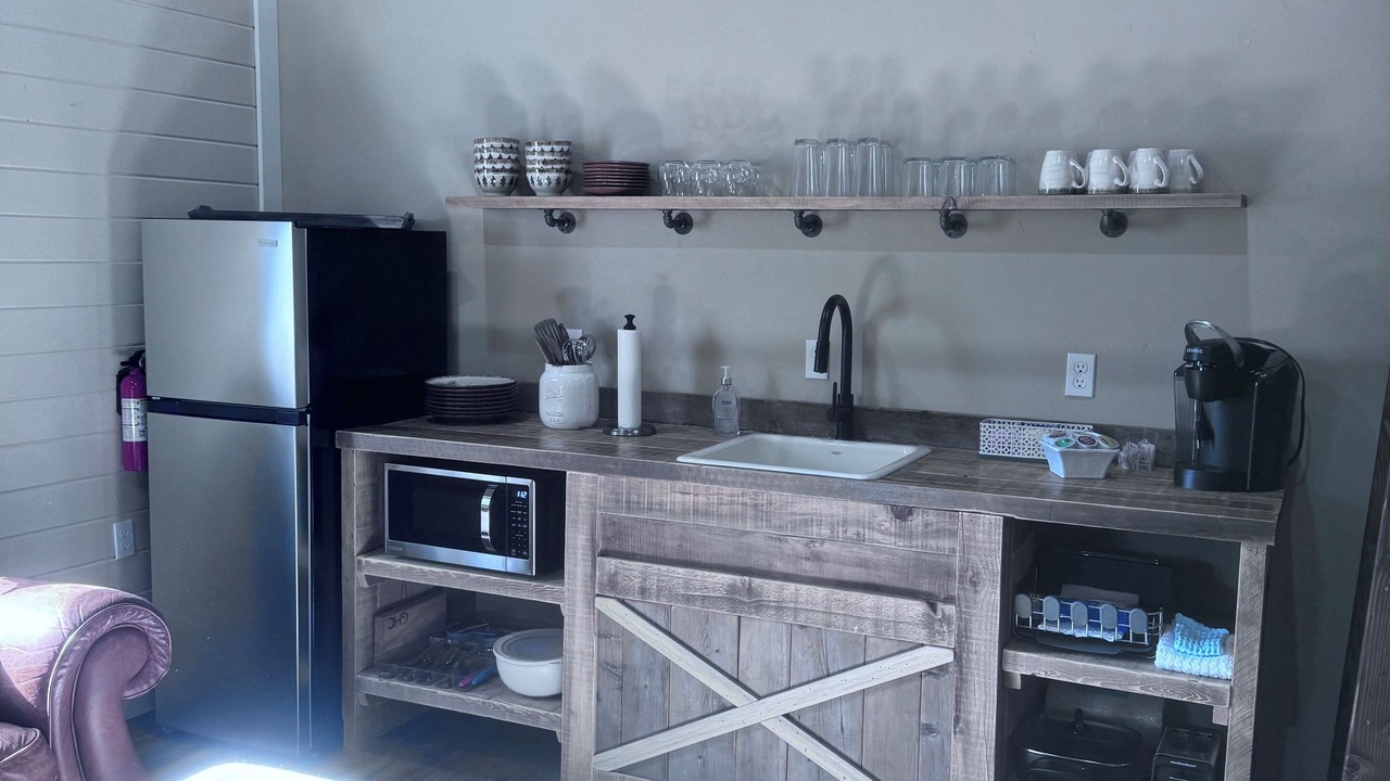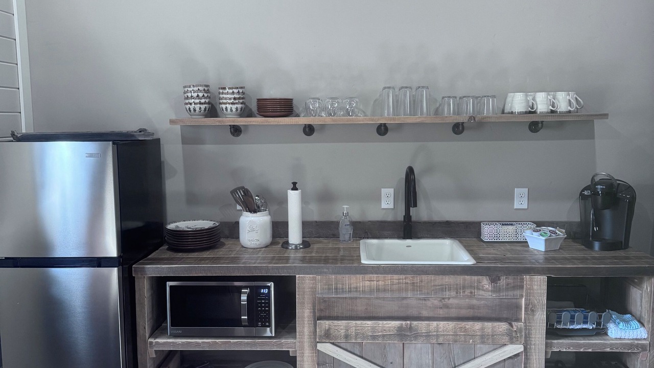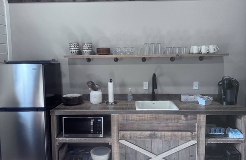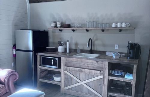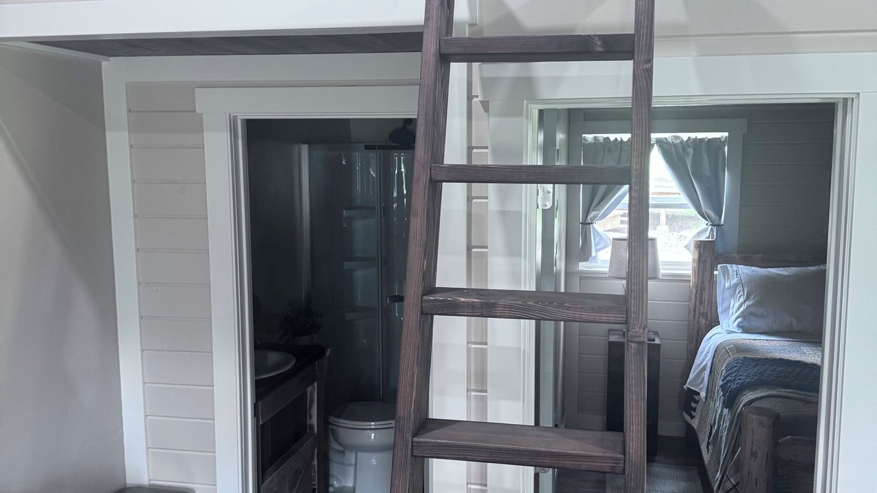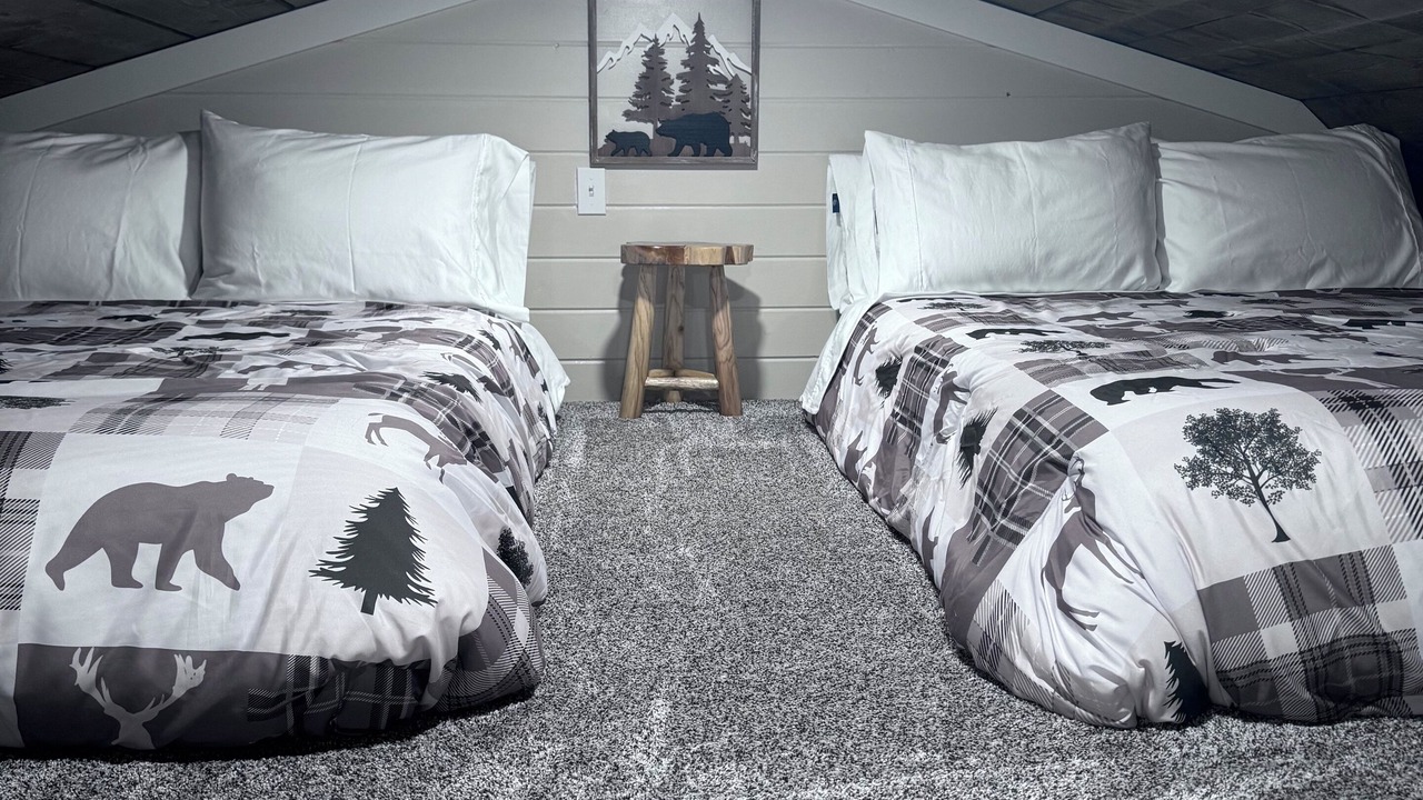 The cabin has one bedroom with a queen bed as well as a loft that has two more queen beds! The kitchen is equipped with mostly every thing but a stove! We do have a convection oven/ microwave and electric skillet to use. As well as a bbq on the porch to enjoy !