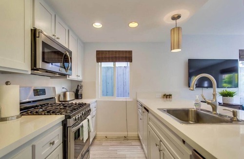 Mission Beach is a unique spot, offering the best of both worlds with easy access to the ocean and the bay. This recently remodeled, surf-inspired bungalow is just 55 steps from the beautiful Mission Bay, making it a perfect escape for water lovers. The open, California-style kitchen is sleek and modern, equipped with stainless steel appliances for all your cooking needs. The cozy living room features a 50-inch flat screen TV and a queen sofa bed with a memory foam mattress for additional sleeping space. The dining area comfortably seats 6, with 4 breakfast bar stools for casual meals.