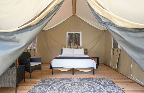 Enjoy our comfortable, furnished 16'x20' camping tent. The Delicate Bluebell boasts a welcoming interior featuring a plush queen sized bed for a restful night's sleep. A cozy seating area provides an intimate space to relax, unwind, and savor the scenic surroundings. Designed with your convenience in mind, our tents include ample storage space for luggage, ensuring a clutter-free and comfortable atmosphere. For your utmost comfort, the nearby bathrooms and showers in our brand new comfort station are equipped with heating, and accessible bathrooms and showers are also available.