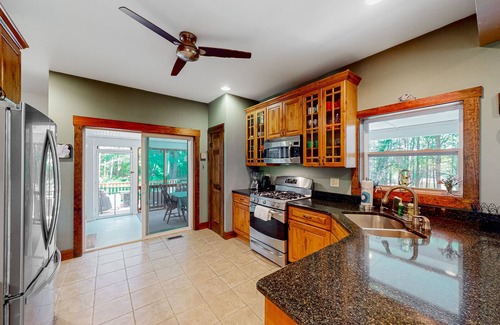 Inside, enjoy an inviting living space with cozy seating, a gas fireplace, smart TV, and family-friendly board games. The chef’s kitchen is fully equipped with modern appliances and a Keurig, with both indoor and porch dining areas. The main floor offers a serene primary suite with a private bath and in-home workout area, while three more bedrooms await upstairs.