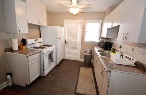 Welcome to our charming bungalow home located in the heart of the historic district. This cozy and updated space features one bedroom and a comfortable sofa bed in the living room, perfect for small families or groups. The bedroom boasts a comfortable bed for a good night's sleep and the living room is equipped with a big 55 inch flat screen TV for entertainment.
