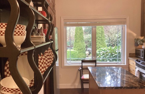 Experience timeless elegance in this renovated historic home located in Hansville. When you open the front door, the cozy living room provides a warm welcoming space with a woodburning fireplace and the custom-built cabinets anchoring the stunning guest quarters. The beautiful bay window facing the gardens has a dining area that will accommodate 7 people. Glowing hardwood floors throughout the guest quarters elude old world charm. The master suite offers a luxurious king bed and views of the front gardens. The ensuite bath offers a roomy tub/shower combination, tall ceilings, marble countertop vanity. We provide all towels and bedding during your vacation stay. If you need to wash a load of clothes, a stackable washer and dryer is located in the hallway. The second bedroom offers a queen size bed and accommodates two additional guests. The third bedroom offers one single bed and a bunkbed which accommodates three people. The compact fully appointed kitchenette is central to the living and sleeping areas of the quarters. Kitchenette is appointed with stylish cupboards, granite counter tops, stainless steel dishwasher and sink, microwave and full size refrigerator. A two burner induction cooktop provides a great set up for meal prep. The kitchenette is pre-stocked with cookware, utensils and tableware, coffeemaker, electric tea pot, waffle iron, toaster, hot plate griddle and blender. Continental breakfast items are also provided for your enjoyment.