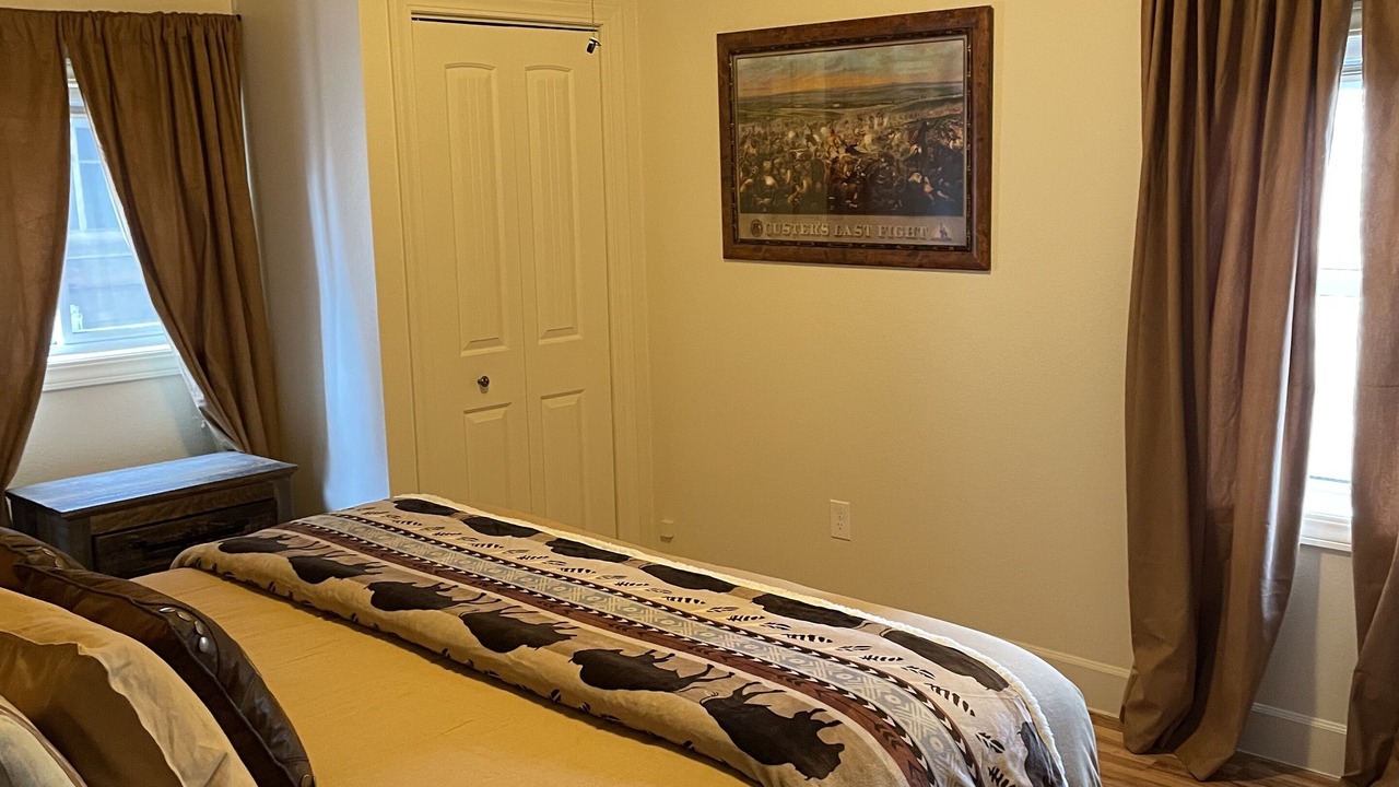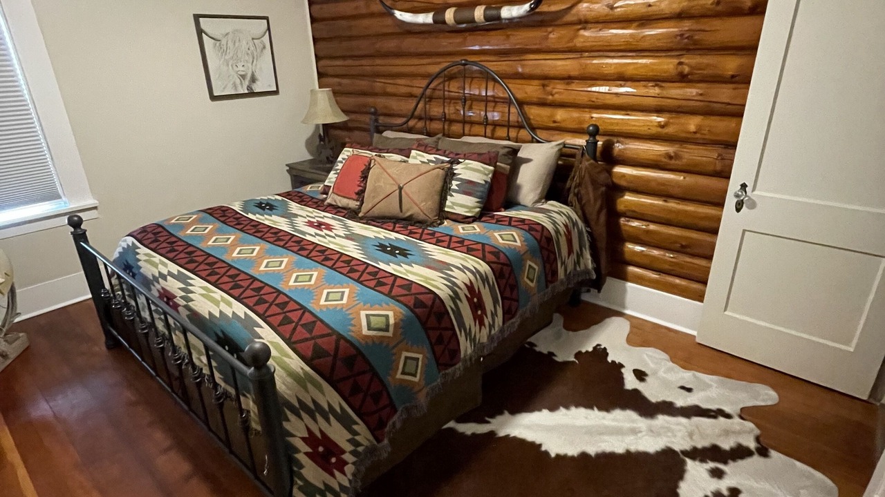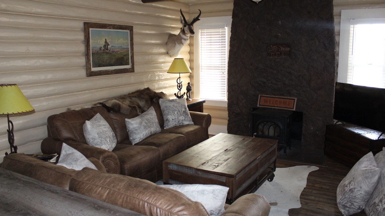 Cozy Historic Log Home on Main street 3 blocks from downtown Buffalo, quiet yet very short walk to downtown restaurants and bars,shops,etc. Large yard to relax in and enjoy a family BBQ, or just hang out. nicely decorated throughout and has everything you'll need for your stay, not your typical rental it is our home away from home and we've outfitted it the way that makes us comfortable , rental or not. If you don't know it already the Buffalo area is chuck full of old west history there are a multitude of historic sites to visit near by, there’s the Little Bighorn battlefield, Fort Kearney historic site or the Jim Gatchell museum, Occidental hotel and saloon built in 1880 with the likes of Buffalo Bill Cody and Theodore Roosevelt passing through it's doors at one time. the beautiful Johnson county courthouse built in 1884 still serves as it did when built. You'll see deer, wild turkeys wondering around town, geese, bald eagles, antelope and prairie dogs through out the area as well, of course the biggest attraction to the area is the Big Horn Mountains that offer fishing, hiking, hunting etc. We suggest doing some homework about the area and select the things that would interest you and your family ahead of time. The home was built by a Laramie county sheriff named Leslie Snow who served a role in the arrest and conviction of Tom Horn, a famous figure in western history. There is still t a "S" symbol built visible in front of the house the Snow family had built into the chimney. We call the house the Snow Cabin.