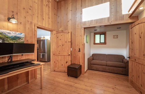 The second living space is a studio that sits above the main living space with a full-sized kitchen, a queen-sized bed, a twin daybed, a bathroom with a combo tub/shower and designated workspace that's perfect for those that work from home. This cozy studio is perfect for a couple or a small family to have some privacy at the Stillwater Mountain Lodge.