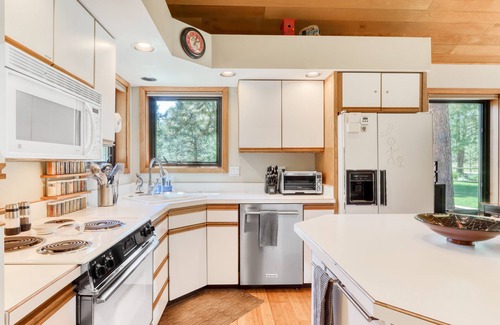 The cabin has contemporary furnishings for a refreshing take on a Western-style getaway. With an open floor plan and spacious loft, your group will enjoy congregating together or find a private spot for some quiet time with a good book. The interior is light and sunny, with a fully equipped kitchen for preparing home-cooked meals. Grab a stool at the island bar to sip a glass of wine, or seat everyone around the dining table for family meals.