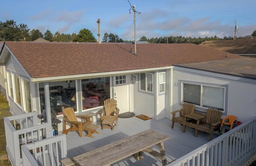 Enjoy relaxing and watching the kites fly on the spacioius front deck with a view of the ocean. Ammenities include hot tub, a large picnic table, large deck chairs, and propane grill.