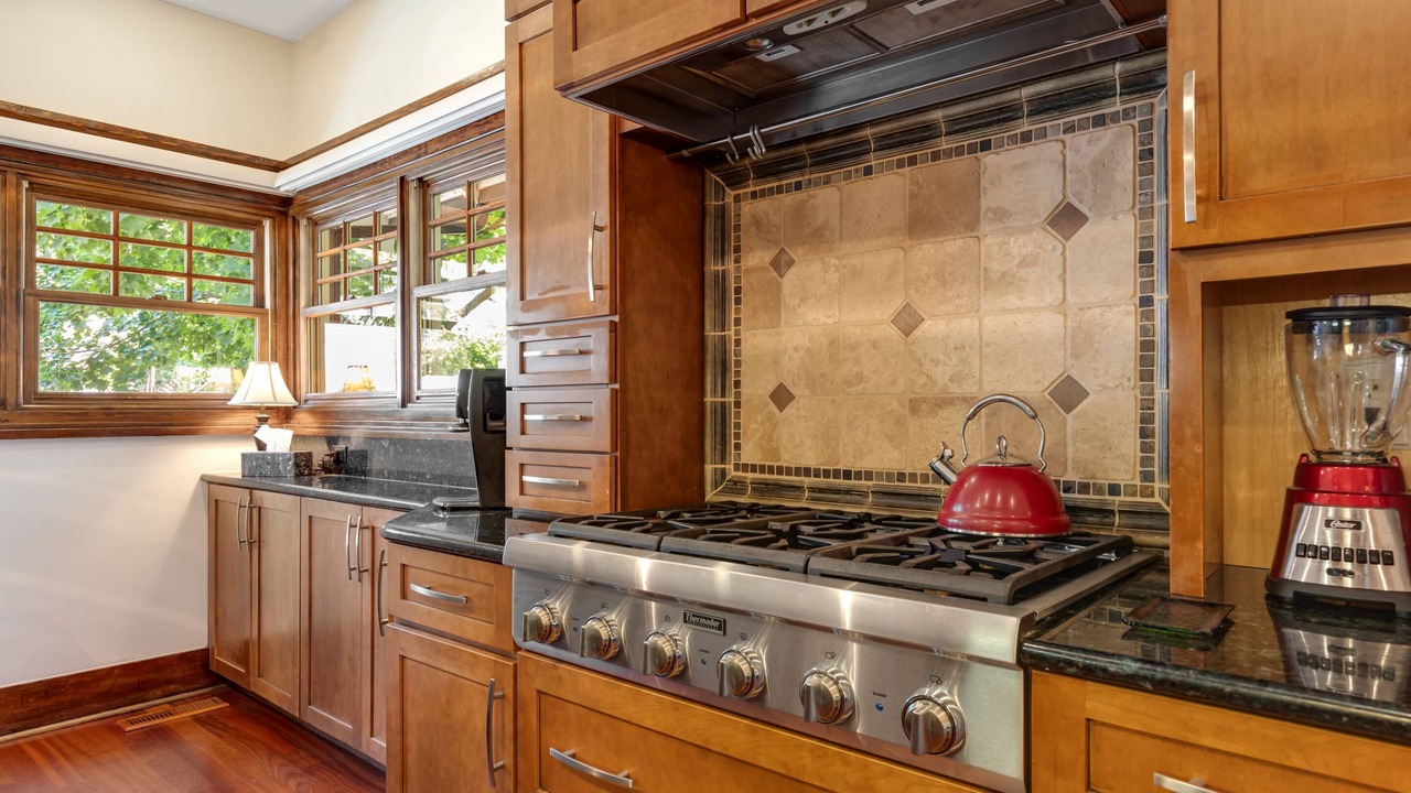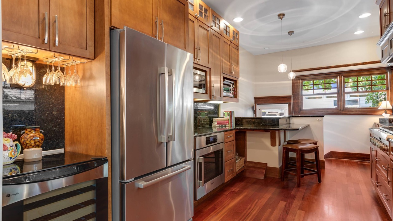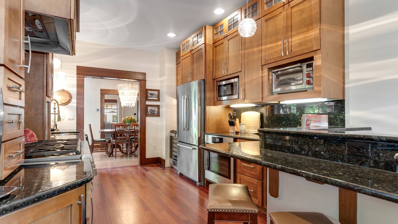 • Fully-equipped high end kitchen featuring beautiful wood cabinetry, breakfast bar with seating for 2, granite countertops, and a professional suite of Thermador® and Bosch® appliances
