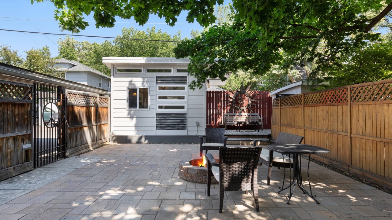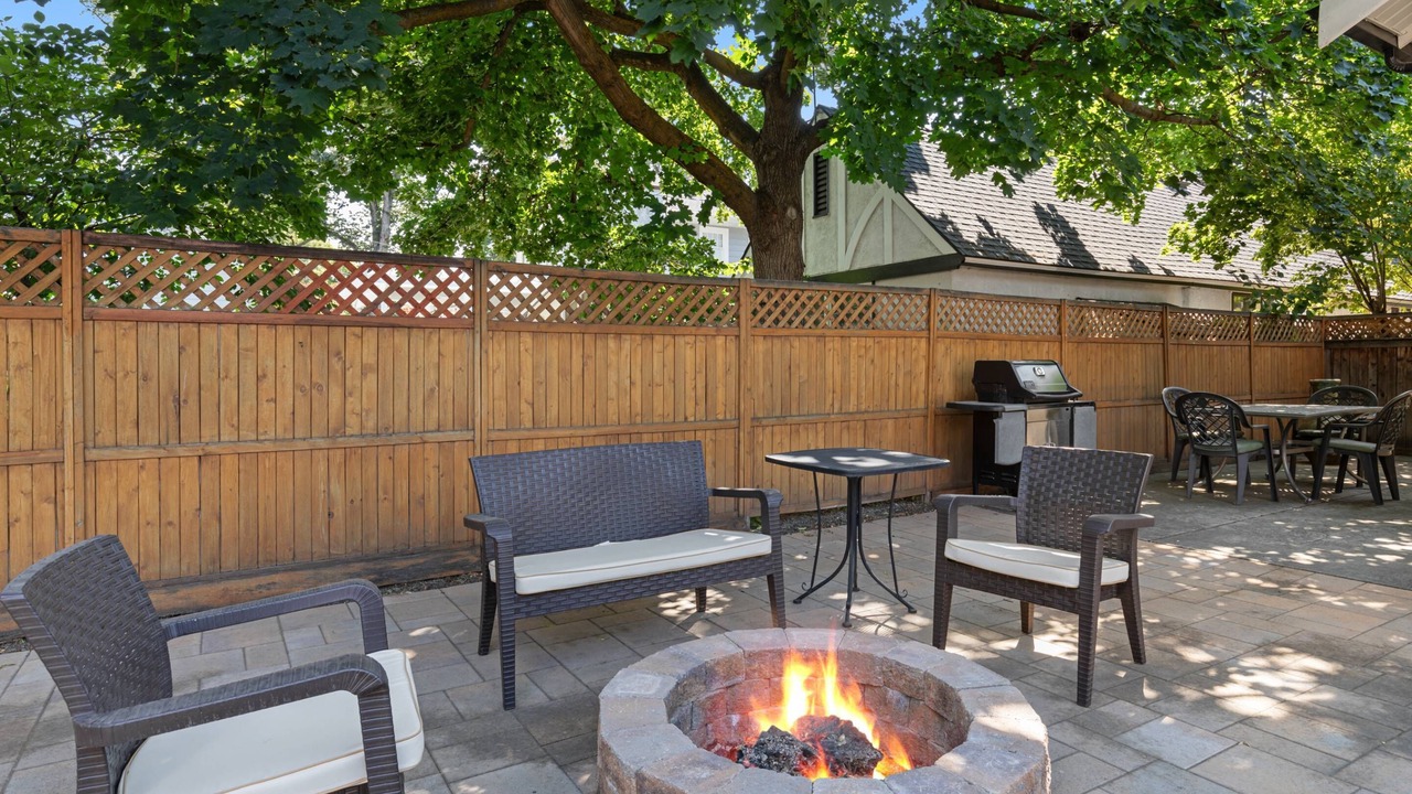 • Private courtyard backyard with seating around fire-pit, outdoor dining table, and BBQ