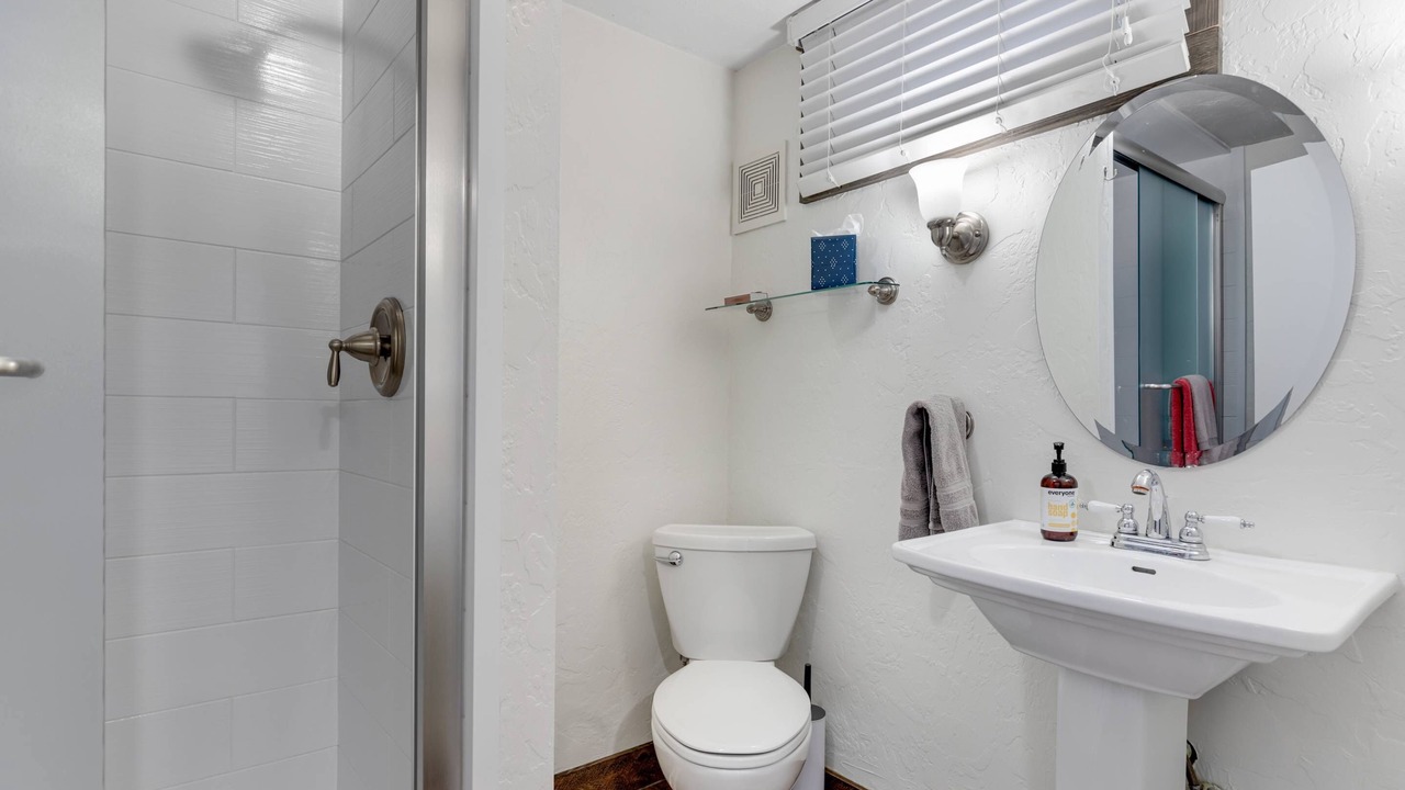 • Lower Level Family en suite FULL bathroom with walk-in shower, toilet, and pedestal sink