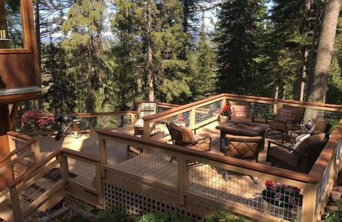 Rent this entire rustic, beautifully handcrafted Jackson Hole Hideout Home which includes a hearty breakfast and daily snacks for all. This lodge-style property, set on 4 acres in Wilson, features wood beamed ceilings, plentiful large windows and cozy spaces both indoors/out. It is a comfortable, casually elegant, multi-level home, providing the peaceful environment you crave as you enjoy all of the natural wonders and adventures that Jackson Hole and the greater Yellowstone ecosystem have to offer. Five individually decorated guest rooms(all in-suites) include sumptuous bedding, a private spa-like bathroom, spacious closet, dresser, reading chair, woodland views and access to your own peaceful patios. During the summer months of May 15-Oct 15th, we include a 6th bedroom suite with an additional kitchen, living room, and private patio. With this additional suite, the home can accommodate 16 people. Our deck is perfect for a micro-wedding, family gathering, corporate retreat, or any other kind of special gathering.