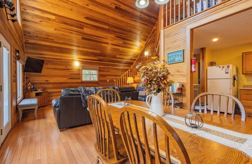 Our 4-br, 3.5-ba lakefront cabin sleeps 13 and offers serene, picturesque views with a private dock two kayaks and a canoe. Unwind in the luxurious hot tub on the deck. Inside, enjoy the comfort of 3 queen beds, 2 full beds, a twin, and a full pullout couch. Stream your favorite shows with Roku & YouTube TV & end your days by the outdoor fire pit under the starry sky. Pet-friendly & perfect for families/groups, this charming cabin promises an unforgettable getaway filled with relaxation and adventure.