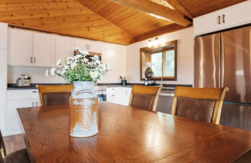 Kitchen: Modern amenities in a rustic atmosphere! The kitchen is complete with microwave, electric stove, dishwasher, refrigerator, freezer, kurig coffee maker, cooking utensils, and more. It is also stocked with plastic baggies, tinfoil, coffee pods, dish soap and dishwasher pods, garbage bags, paper towels, and a small selection of spices. Table seating space for 14.