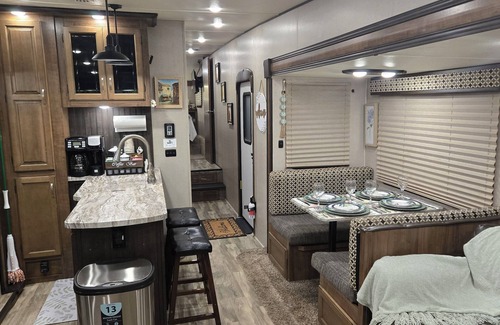 This RV sleeps 6. Has 2 bedrooms-one with a queen bed and the other with 2 bunk beds. The cozy living room features a sofa bed. Guests can enjoy amenities like Wi-Fi, Smart TV, Netflix, Disney+, Hulu, live TV, Bluetooth surround sound speakers inside and outside the RV, a coffee bar, linens, a pool towel, and AC/Heater during their stay for added convenience. The RV is fully equipped to ensure you have the most enjoyable stay possible.