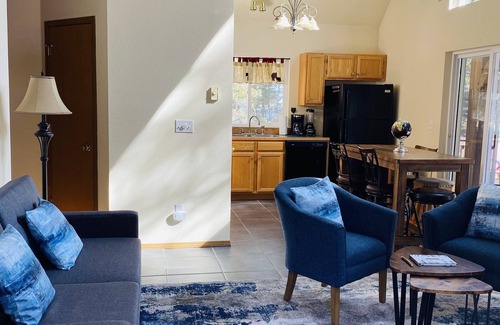 A cozy cottage nestled in the heart of the Many Lakes Subdivision, surrounded by trees on 1.5 acres of peaceful nature. Many Lakes is host to 8 lake parks, and our home itself is only steps away from the closest lake. Our home is surrounded by trees, yet is still a convenient drive to either Kalispell or Bigfork for the necessary amenities. It’s a perfect escape to relax and recharge. Our home includes an open living and kitchen area, with a vaulted ceiling, and is warmed by a crackling wood-burning stove. On the main floor there are two bedrooms, one with a queen-size bed and the other with a twin/full bunk. Upstairs is a loft with a queen pull out futon couch and living room area.